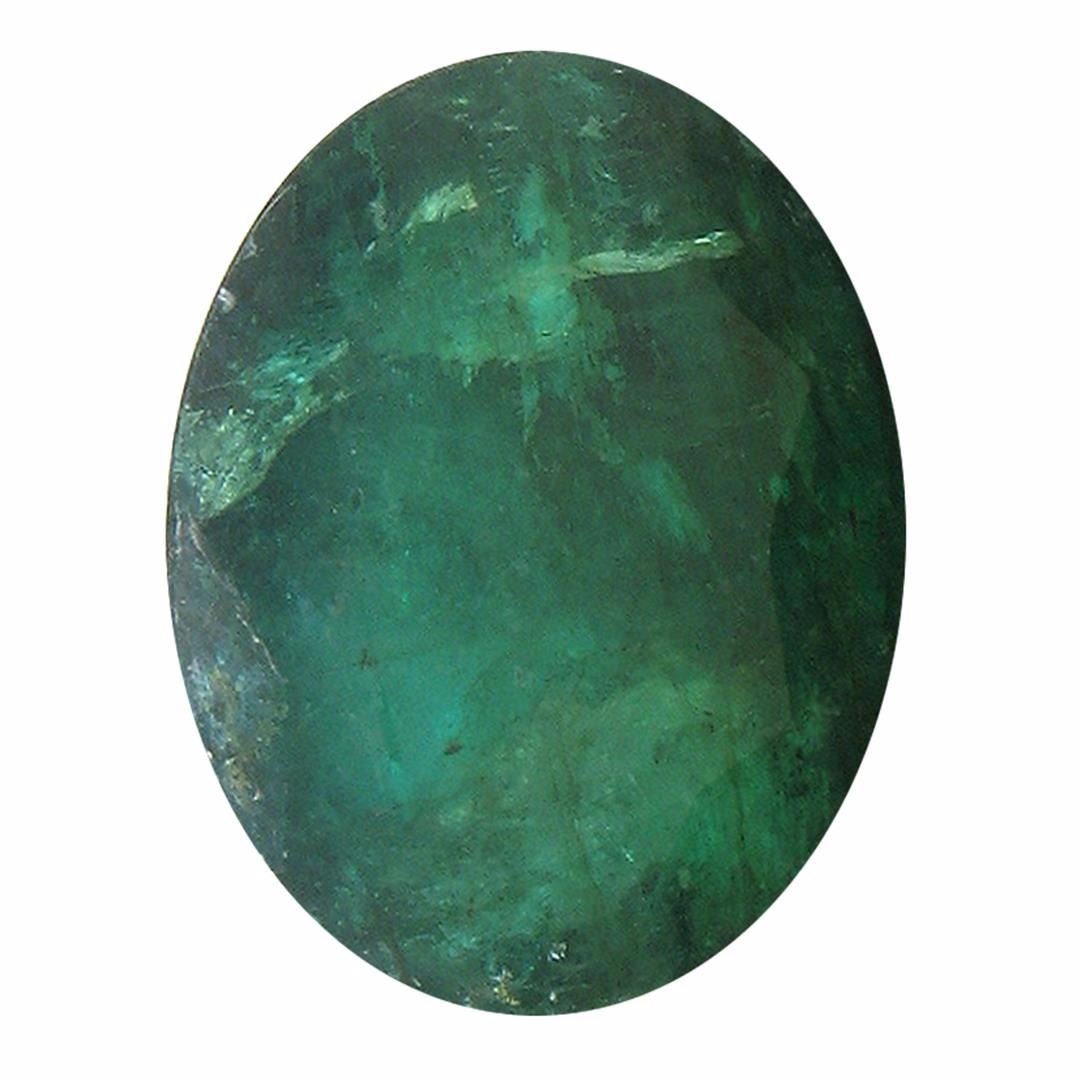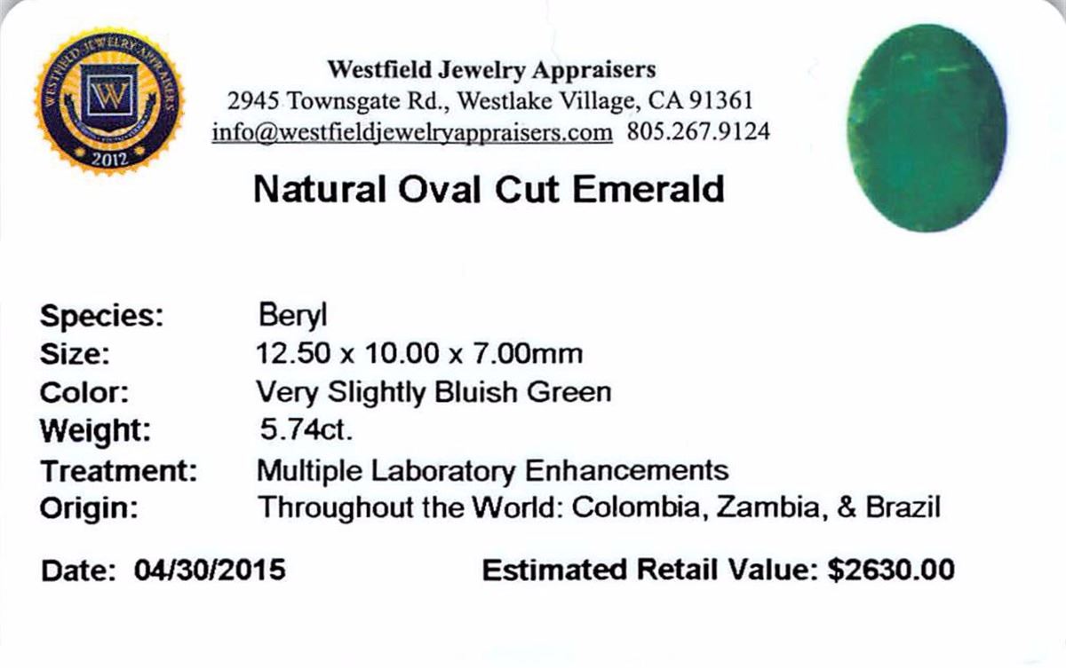 One oval mixed cut natural emerald exact weight 5.74ct., clarity is heavily included, type III, medium dark, very slightly grayish, very slightly bluish green color, (GIA vslbG 6/3), cut is good. Westfield Appraised at $2,630.00.