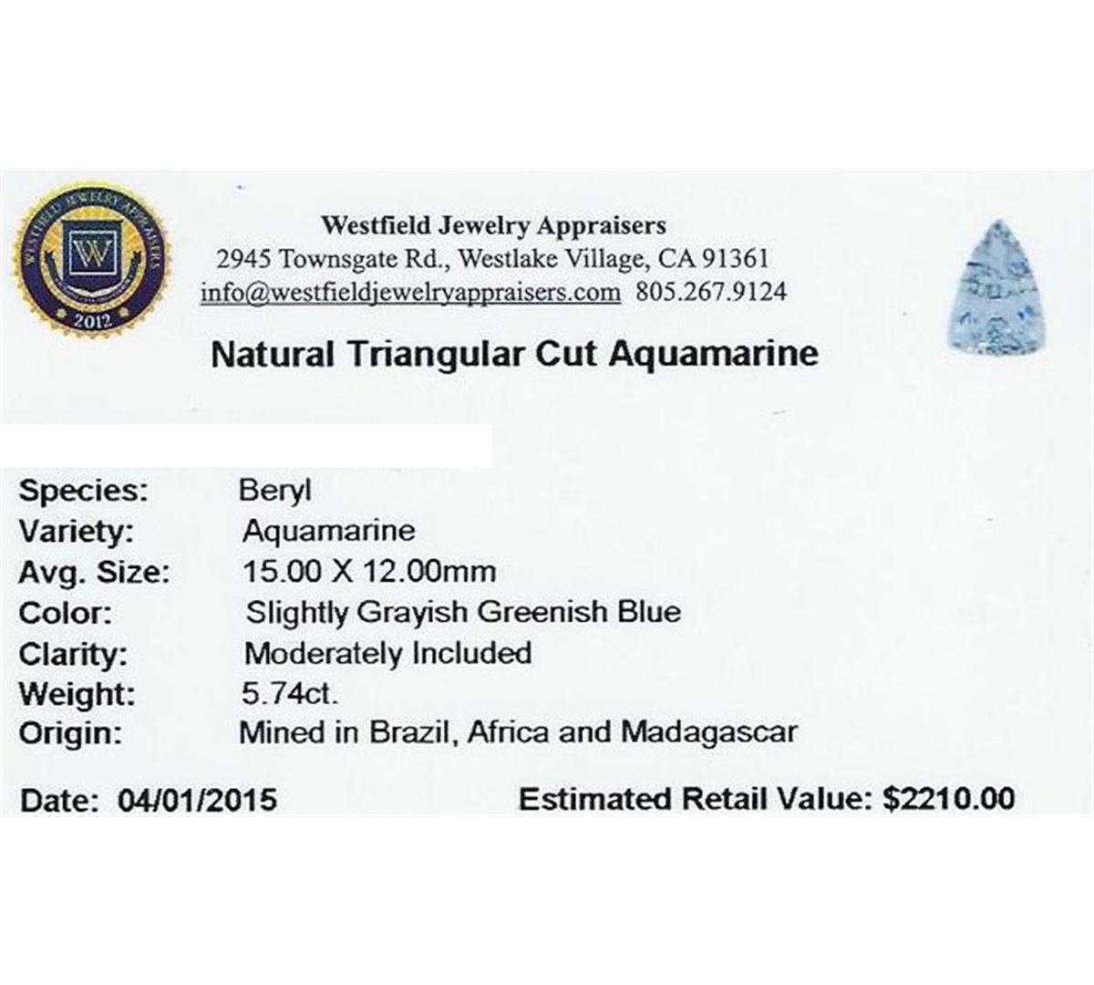 One triangle mixed cut natural aquamarine exact weight 5.74ct., clarity is moderately included, type I, medium, very slightly grayish, very slightly greenish blue color, (GIA vslgB 5/3), cut is good. Westfield Appraised at $2,210.00.