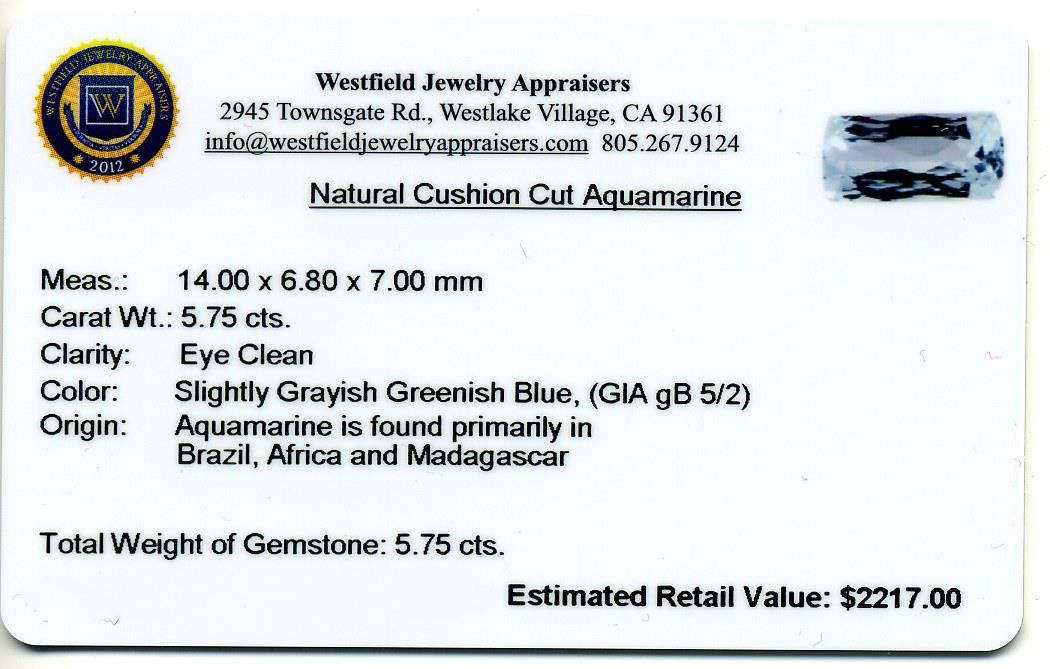 5.75ct Cushion Cut Natural Cushion Cut Aquamarine. Westfield Appraised.