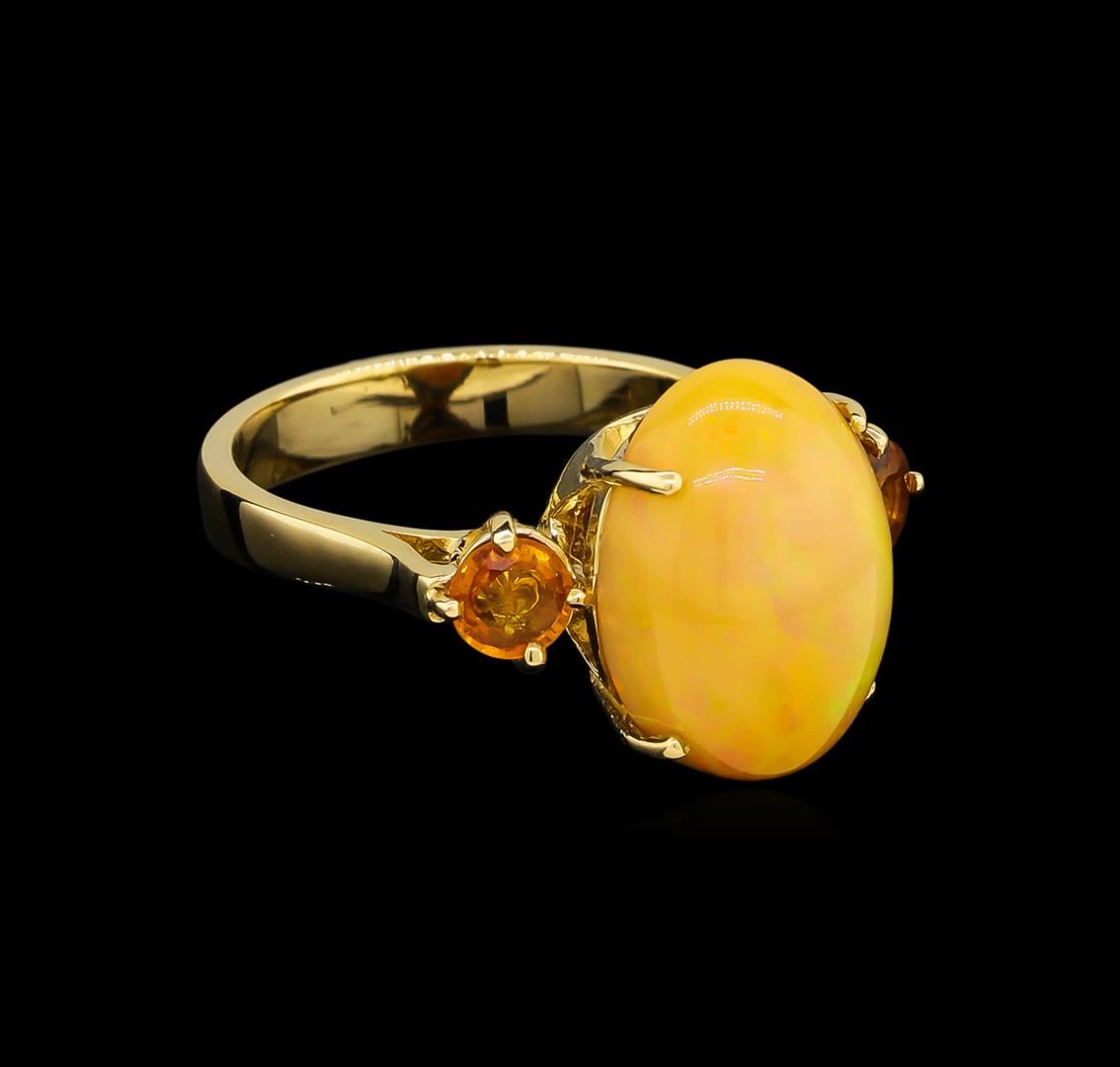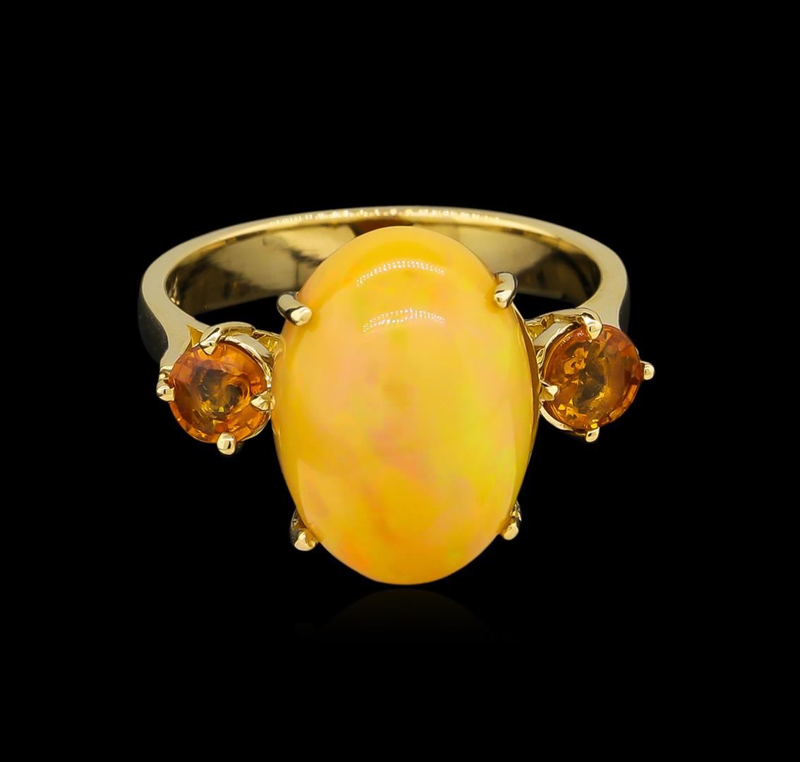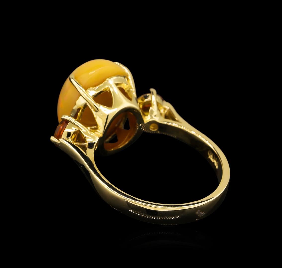 One ring featuring: 14KT yellow gold weighing 4.28 grams containing one opal with a total weight of 5.07ct and two orange sapphires with a total weight of 0.68ct.