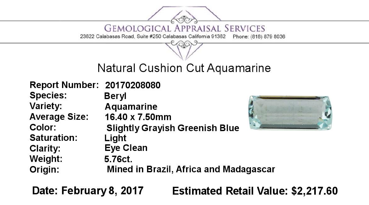 One natural cushion cut aquamarine with an exact weight of 5.76ct., clarity is eye clean, slightly grayish greenish blue, light. Gemological Appraisals Services estimates the retail value at $2217.6 GAS Appraised.
