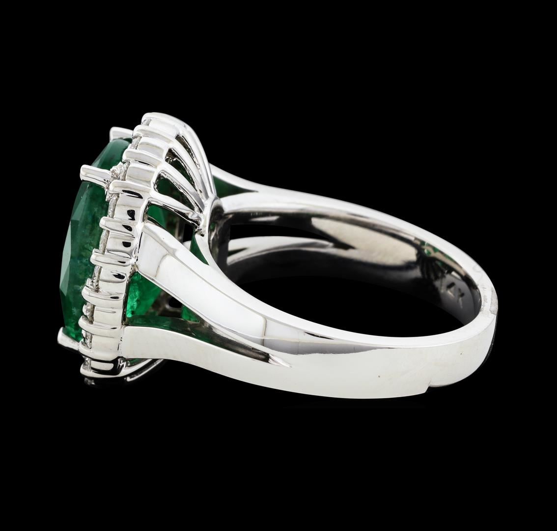 One electronically tested 14KT white gold lady's cast fashion ring with a split shank basket halo with a bright polish finish. The featured lady's ring has a shank measuring 3.29 millimeters wide. Identified with markings of '14K'. Condition is new, good workmanship. Containing: One prong set oval modified mixed cut natural emerald, measuring 13.24 x 10.86 x 6.40mm, (depth est.) 10%. bulge factor, approximate weight of 5.76ct., clarity is heavily included, medium dark, moderately strong, green color, (GIA G 6/4), cut is good. Transmitting light somewhat diffusely, semi-transparent to translucent. Indications of oil residue. Naturally occurring internal & external characteristics are present. Colored gemstones are presumed to have been subjected to commonly used enhancement processes. Graded in the setting. Twenty-Two prong set round brilliant cut diamonds, measuring 2.00 - 1.90 x 1.19mm (depth est.) approximate total weight of 22 Stones = 0.60ct. Graded in the setting. Clarity SI-1 to SI-3. Color: H - I Cut Good. Total Weight of Colored Stones 5.76ct.. Total Weight of Diamonds 0.60ct.. Total Weight of Ring 10.20gm. GAS Appraised at $8,920.00.