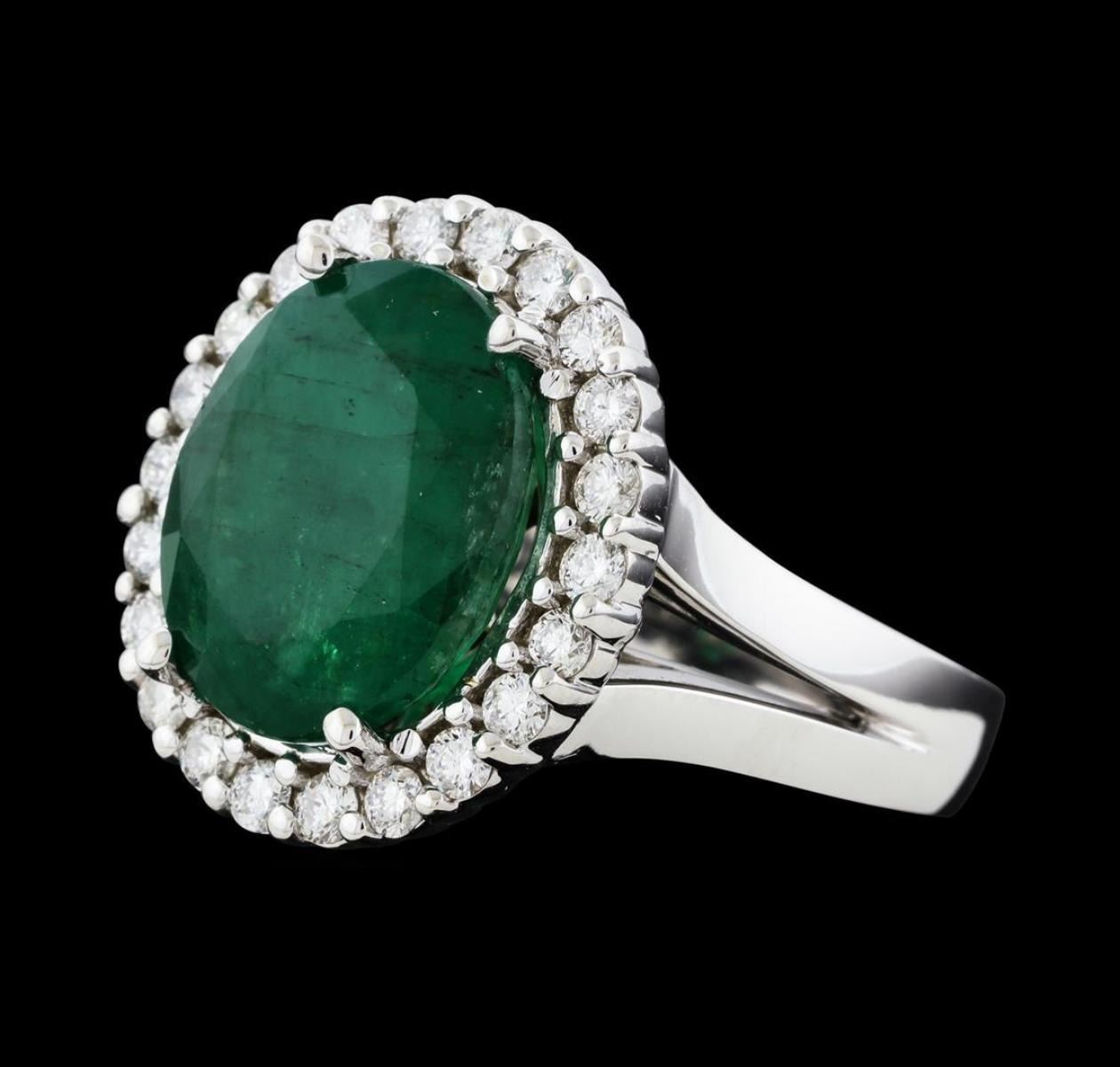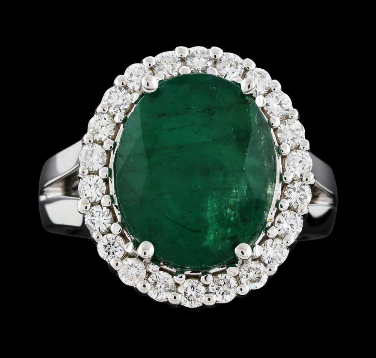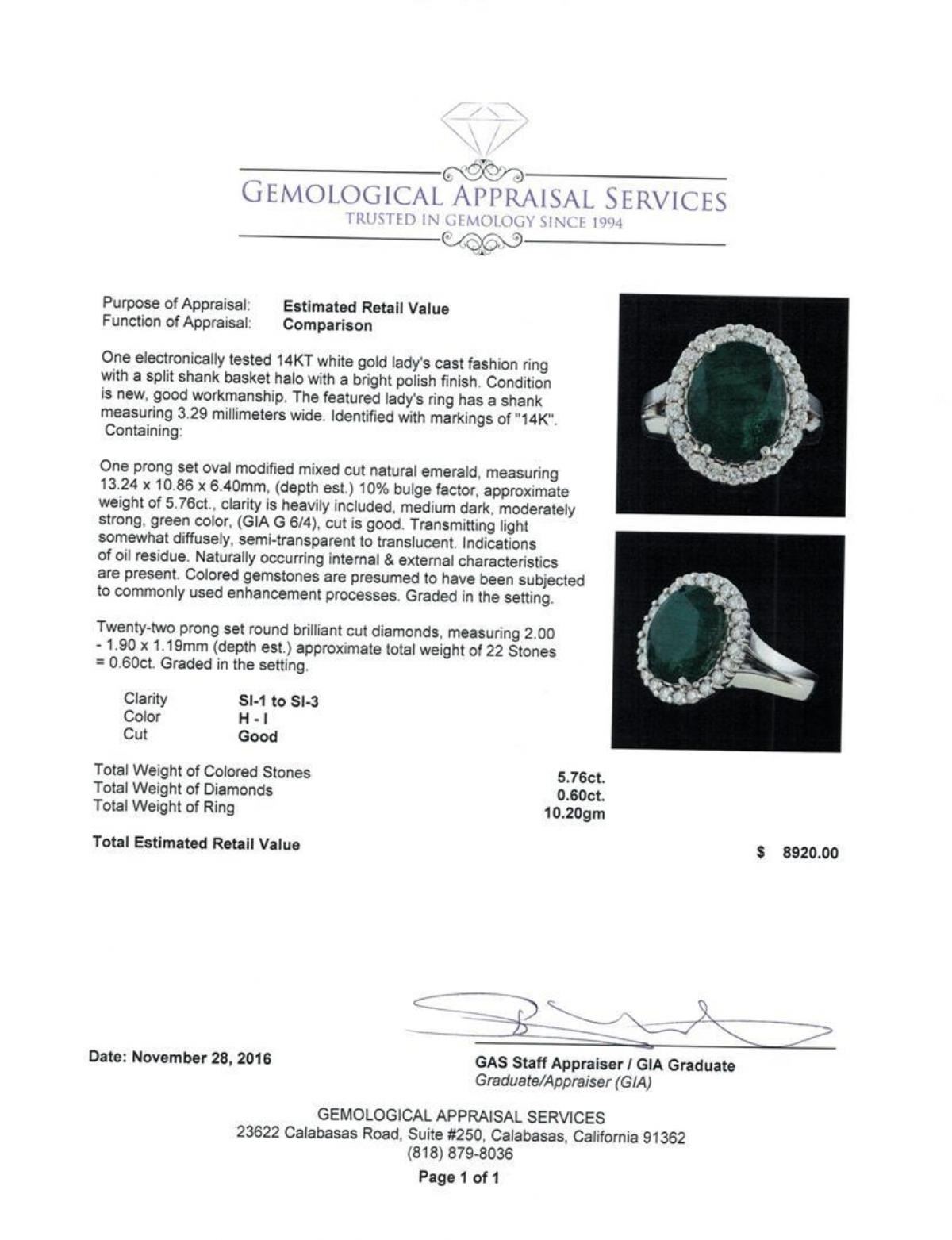 One electronically tested 14KT white gold lady's cast fashion ring with a split shank basket halo with a bright polish finish. The featured lady's ring has a shank measuring 3.29 millimeters wide. Identified with markings of '14K'. Condition is new, good workmanship. Containing: One prong set oval modified mixed cut natural emerald, measuring 13.24 x 10.86 x 6.40mm, (depth est.) 10%. bulge factor, approximate weight of 5.76ct., clarity is heavily included, medium dark, moderately strong, green color, (GIA G 6/4), cut is good. Transmitting light somewhat diffusely, semi-transparent to translucent. Indications of oil residue. Naturally occurring internal & external characteristics are present. Colored gemstones are presumed to have been subjected to commonly used enhancement processes. Graded in the setting. Twenty-Two prong set round brilliant cut diamonds, measuring 2.00 - 1.90 x 1.19mm (depth est.) approximate total weight of 22 Stones = 0.60ct. Graded in the setting. Clarity SI-1 to SI-3. Color: H - I Cut Good. Total Weight of Colored Stones 5.76ct.. Total Weight of Diamonds 0.60ct.. Total Weight of Ring 10.20gm. GAS Appraised.