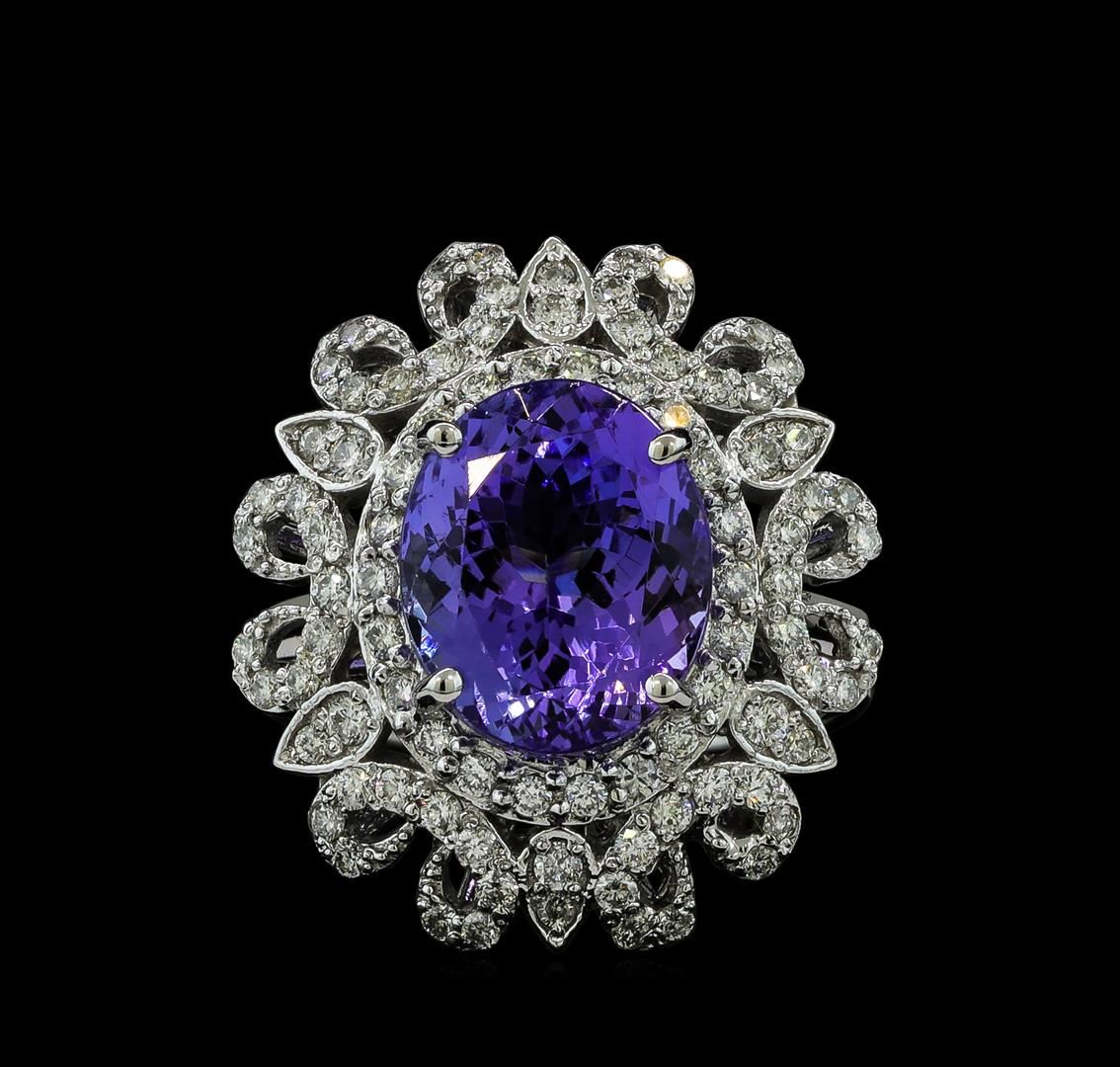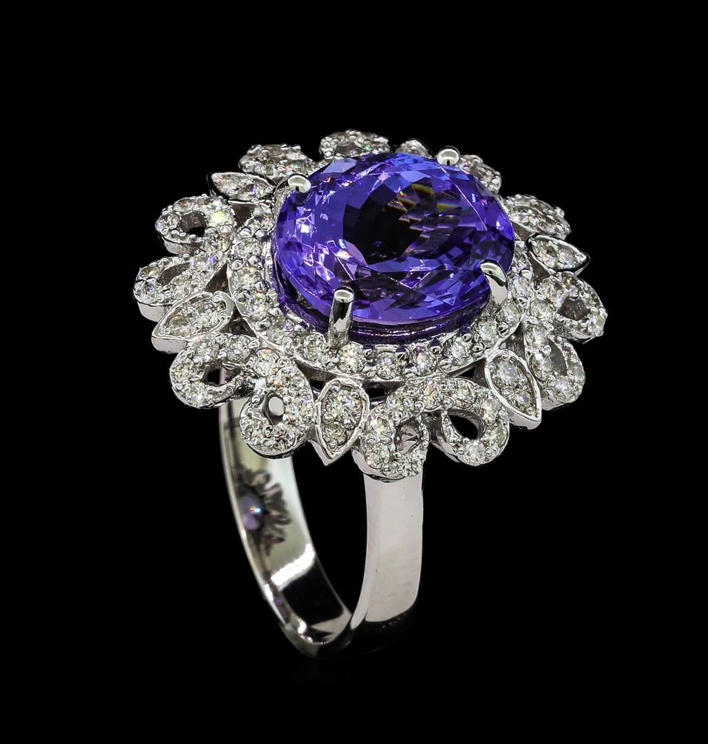 One electronically tested 14KT white gold lady's cast fashion ring with a scalloped halo with a bright polish finish. The featured lady's ring has a shank measuring 3.37 millimeters wide. Identified with markings of 'K14'. Condition is new, good workmanship. Containing: One prong set oval modified brilliant cut natural tanzanite, measuring 11.70 x 9.59 x 7.16mm, (depth est.) 2%. bulge factor, approximate weight of 5.76ct., clarity is eye clean, medium, moderately strong, violet color, (GIA V 5/4), cut is very good. Transmitting light with no distortion, transparent. Colored gemstones are presumed to have been subjected to commonly used enhancement processes. Graded in the setting. Six prong set round brilliant cut diamonds, measuring 1.60 - 1.55 x 0.98mm (depth est.) approximate total weight of 6 Stones = 0.09ct. Graded in the setting. Clarity SI-1 to I-1. Color: H - I Cut Good Fifty-Two prong set round brilliant cut diamonds, measuring 1.40 - 1.35 x 0.86mm (depth est.) approximate total weight of 52 Stones = 0.53ct. Graded in the setting. Clarity SI-1 to I-1. Color: H - I Cut Good Thirty prong set round brilliant cut diamonds, measuring 1.30 - 1.20 x 0.78mm (depth est.) approximate total weight of 30 Stones = 0.23ct. Graded in the setting. Clarity SI-1 to SI-2. Color: H - I Cut Good. Total Weight of Colored Stones 5.76ct.. Total Weight of Diamonds 0.85ct.. Total Weight of Ring 8.20gm. GAS Appraised at $12,410.00.
