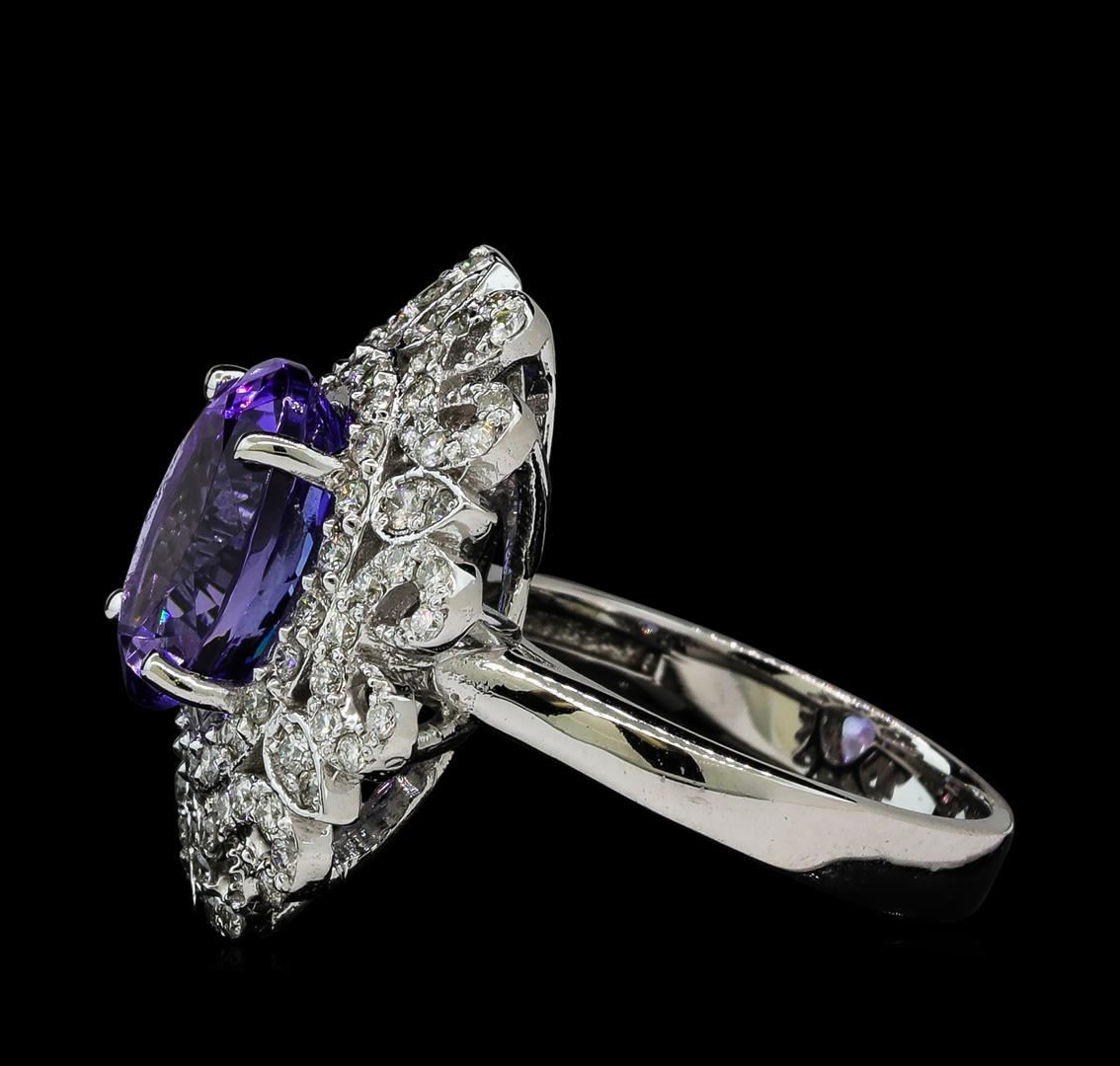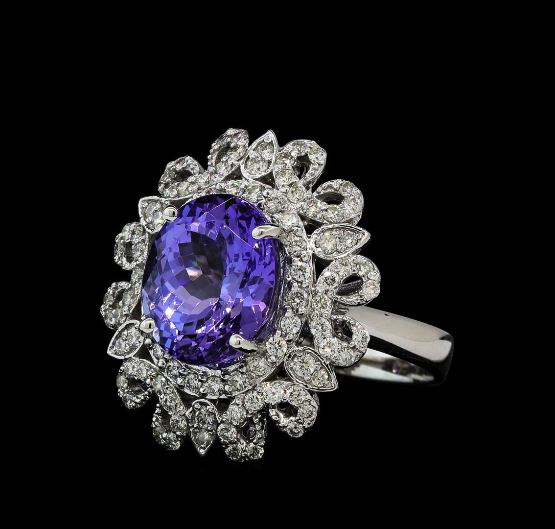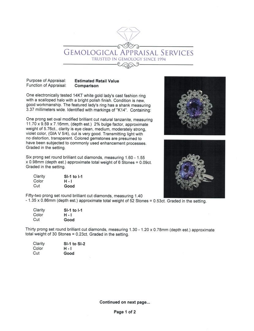 One electronically tested 14KT white gold lady's cast fashion ring with a scalloped halo with a bright polish finish. The featured lady's ring has a shank measuring 3.37 millimeters wide. Identified with markings of 'K14'. Condition is new, good workmanship. Containing: One prong set oval modified brilliant cut natural tanzanite, measuring 11.70 x 9.59 x 7.16mm, (depth est.) 2%. bulge factor, approximate weight of 5.76ct., clarity is eye clean, medium, moderately strong, violet color, (GIA V 5/4), cut is very good. Transmitting light with no distortion, transparent. Colored gemstones are presumed to have been subjected to commonly used enhancement processes. Graded in the setting. Six prong set round brilliant cut diamonds, measuring 1.60 - 1.55 x 0.98mm (depth est.) approximate total weight of 6 Stones = 0.09ct. Graded in the setting. Clarity SI-1 to I-1. Color: H - I Cut Good Fifty-Two prong set round brilliant cut diamonds, measuring 1.40 - 1.35 x 0.86mm (depth est.) approximate total weight of 52 Stones = 0.53ct. Graded in the setting. Clarity SI-1 to I-1. Color: H - I Cut Good Thirty prong set round brilliant cut diamonds, measuring 1.30 - 1.20 x 0.78mm (depth est.) approximate total weight of 30 Stones = 0.23ct. Graded in the setting. Clarity SI-1 to SI-2. Color: H - I Cut Good. Total Weight of Colored Stones 5.76ct.. Total Weight of Diamonds 0.85ct.. Total Weight of Ring 8.20gm. GAS Appraised at $12,410.00.