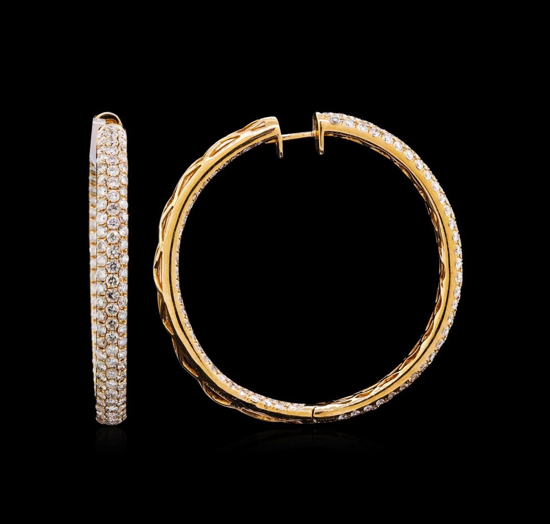 One electronically tested 18KT rose gold lady's combination cast & assembled inside out hoop earrings with hinged, snap locking posts with a bright polish finish. Featured ladies' hoop earrings measure 42 millimeters in diameter with 4.5 millimeters in width. Trademark is MICHA. Identified with markings of "18K 750". Condition is new, good workmanship. Containing: Three Hundred Fifty-Four prong set round brilliant cut diamonds, measuring 1.70 - 1.60 x 1.02mm (depth est.) approximate total weight of 354 Stones = 5.77ct. Graded in the setting. Clarity: VS-2 to SI-2. Color: H - I. Cut Very Good. Total Weight of Diamonds 5.77ct. Total Weight of Earrings 16.40gm. GAS Appraised at $17,940.00.