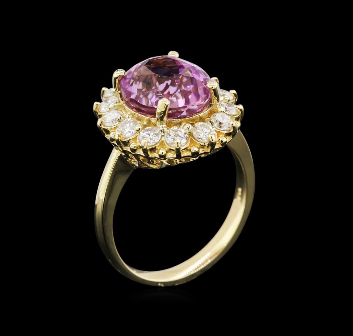 One 14K Yellow Gold Lady's Ring. 6.50 GR. Containing: Main Gemstones: Identity: Kunzite. Carat Weight 5.77 CTS TW. Shape & Measurement: Oval Shape. Quality: Fine Color. Adjacent Gemstones: Identity: Natural Diamond. Shape: Round Cut. Carat Weight: 0.88 CTS TW. Quality: SI Clarity, G-H Color. All Fine Cutting And Proportions. Total Gemstones Weight: 6.65 CTW TW. RBGS Appraised.