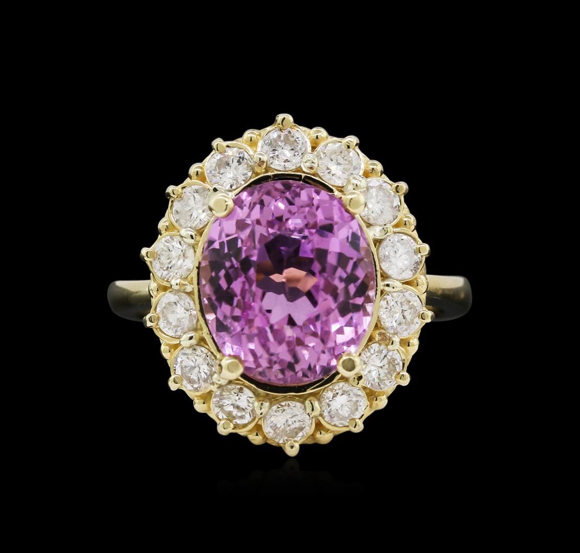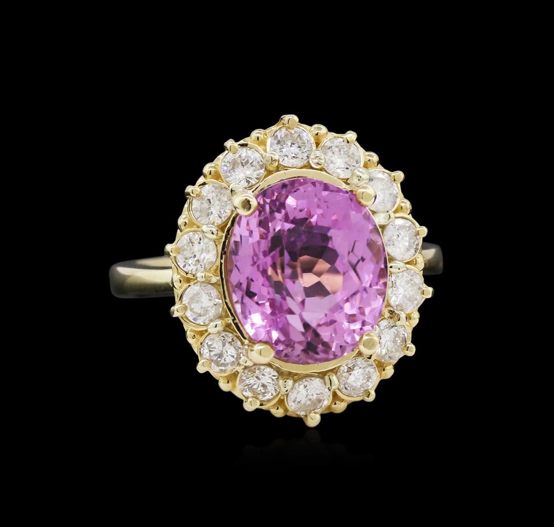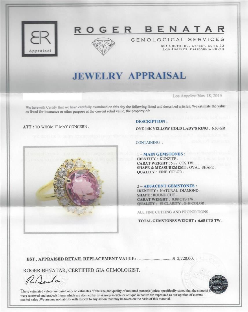 One 14K Yellow Gold Lady's Ring. 6.50 GR. Containing: Main Gemstones: Identity: Kunzite. Carat Weight 5.77 CTS TW. Shape & Measurement: Oval Shape. Quality: Fine Color. Adjacent Gemstones: Identity: Natural Diamond. Shape: Round Cut. Carat Weight: 0.88 CTS TW. Quality: SI Clarity, G-H Color. All Fine Cutting And Proportions. Total Gemstones Weight: 6.65 CTW TW. RBGS Appraised.