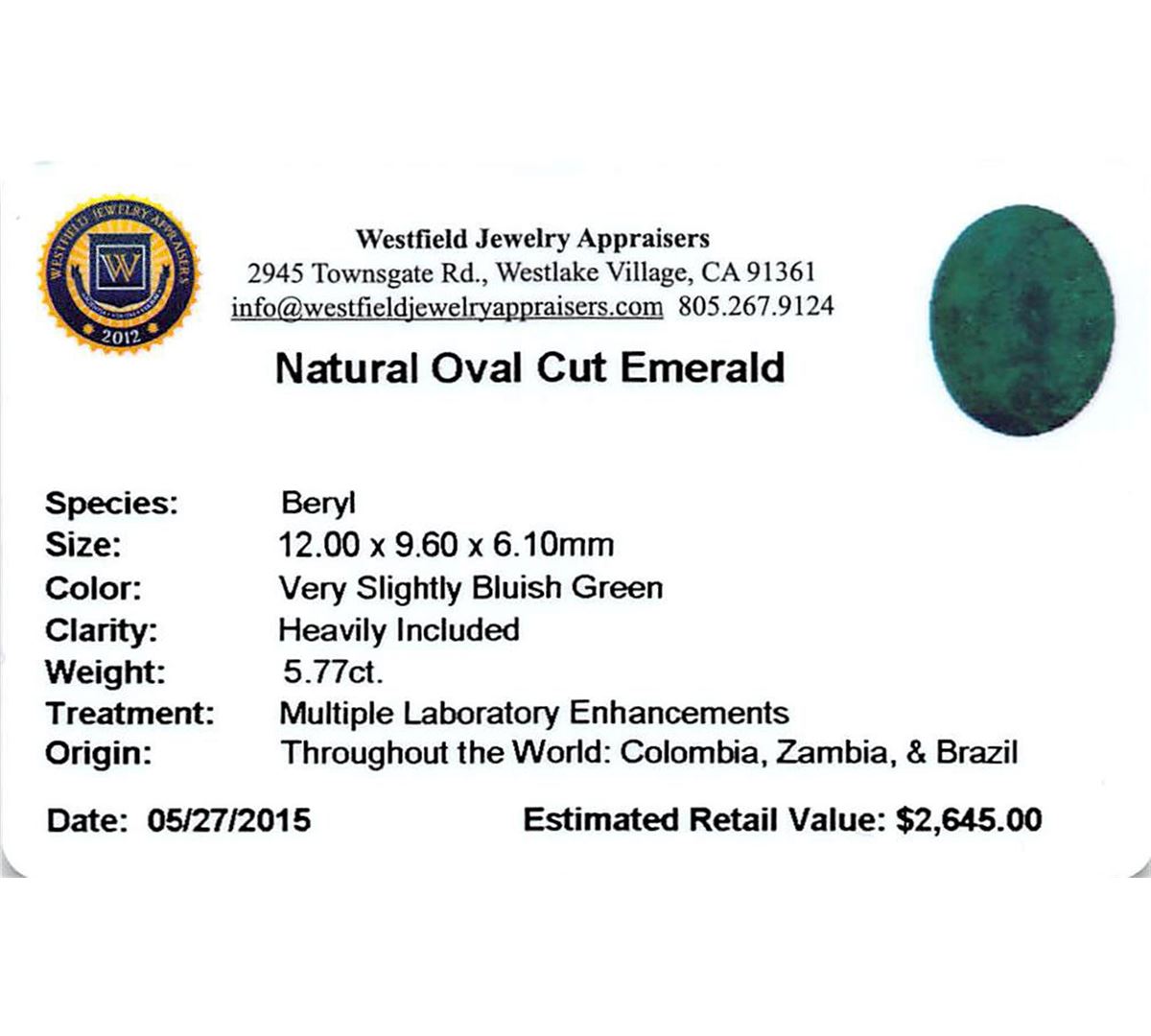 One oval mixed cut natural emerald, measuring 12.00 x 9.60 x 6.10mm, exact weight 5.77ct., clarity is heavily included, medium dark, very slightly grayish, very slightly bluish green color, (GIA vslbG 6/3), cut is good. Transmitting light somewhat diffusely, translucent, Naturally occurring internal & external characteristics are present, Indications of multiple laboratory enhancements, including high temperature heat treatment. Westfield Appraised at $2,645.00.