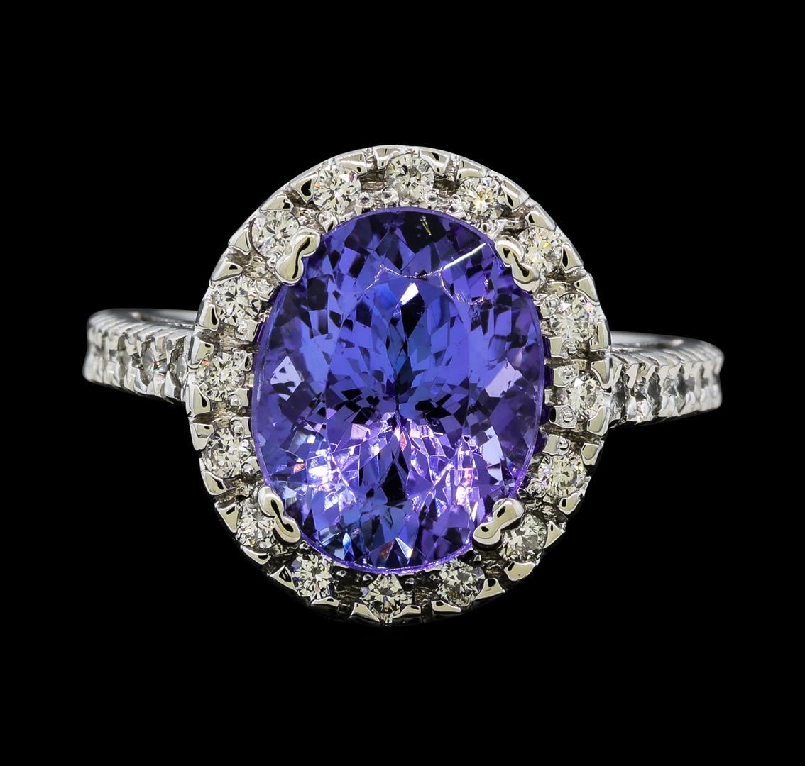 One electronically tested 14KT white gold lady's cast fashion ring with a cathedral shank with a halo with a bright polish finish. The featured lady's ring has a shank measuring 2.46 millimeters wide. Identified with markings of '14K'. Condition is new, good workmanship. Containing: One prong set oval modified brilliant cut natural tanzanite, measuring 12.13 x 9.66 x 7.54mm, (depth est.) approximate weight of 5.77ct., clarity is eye clean, medium, moderately strong, violet color, (GIA V 5/4), cut is very good. Transmitting light with no distortion, transparent. Colored gemstones are presumed to have been subjected to commonly used enhancement processes. Graded in the setting. Twenty-Eight prong set round brilliant cut diamonds, measuring 1.70 - 1.65 x 1.04mm (depth est.) approximate total weight of 28 Stones = 0.50ct. Graded in the setting. Clarity SI-1 to I-1. Color: G - H Cut Good. Total Weight of Colored Stones 5.77ct.. Total Weight of Diamonds 0.50ct.. Total Weight of Ring 7.20gm. GAS Appraised at $9,410.00.