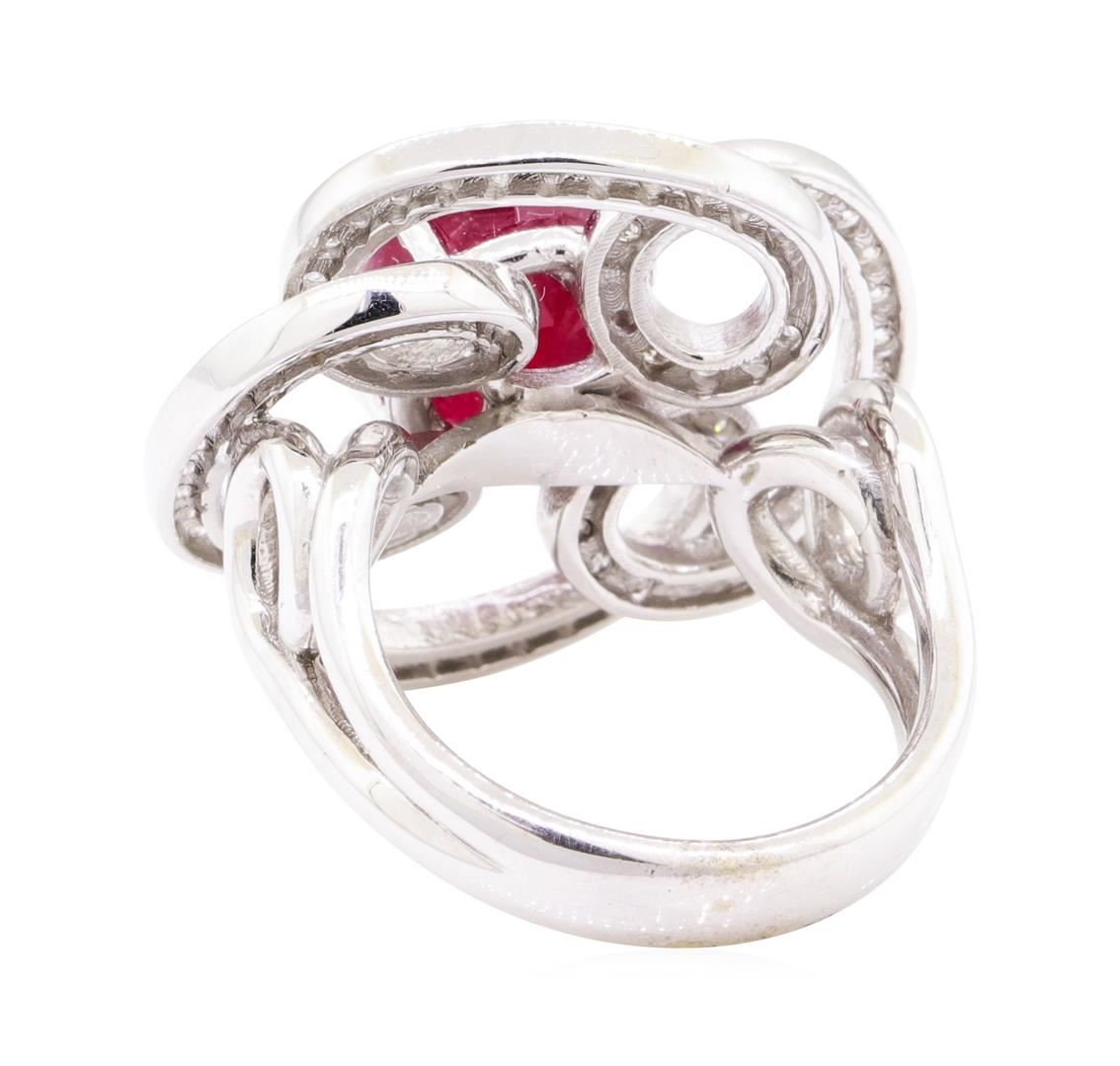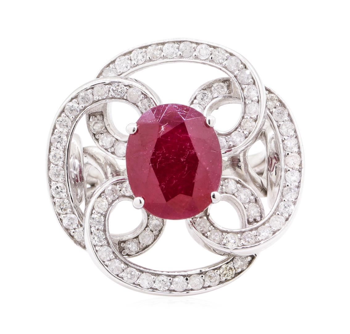 One electronically tested 14KT white gold lady's cast fashion ring with a scalloped halo with a bright polish finish. The featured lady's ring has a shank measuring 4.10 millimeters wide. Identified with markings of '14K'. Condition is new, good workmanship. Containing: One prong set oval modified mixed cut natural ruby-glass composite, measuring 10.98 x 9.09 x 5.60mm, (depth est.) approximate weight of 4.78ct., clarity is heavily included, medium dark, very slightly brownish, red color, (GIA R 6/3), cut is good. Transmitting light somewhat diffusely, semi-transparent to translucent. Naturally occurring internal & external characteristics are present. Indications of laboratory high temperature heat treatment, with glass & flux additives. Colored gemstones are presumed to have been subjected to commonly used enhancement processes. Graded in the setting. Sixty prong set round brilliant cut diamonds, measuring 1.60 - 1.55 x 0.98mm (depth est.) approximate total weight of 60 Stones = 1.00ct. Graded in the setting. Color G - I Clarity I-1 to I-2 Cut Good. Total Weight of Colored Stones 4.78ct.. Total Weight of Diamonds 1.00ct.. Total Weight of Ring 12.40gm GAS Appraised at $3525.00. GAS Appraised at $3,525.00.