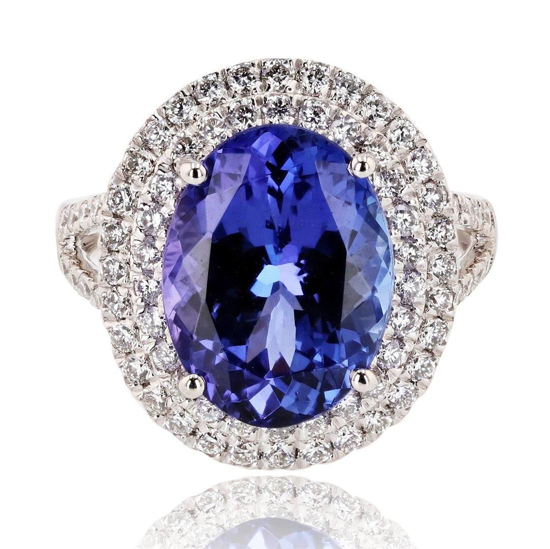 5.78ct Tanzanite and 0.93ctw Diamond Platinum Ring. Platinum Tanzanite & Diamond Ring One polished, stamped, and tested platinum ring with a bright finish. The ring is mounted with: 1 genuine tanzanite center stone weighing approximately 5.78 carat, and 82 genuine round diamonds weighing approximately 0.93 carats. This item weighs 9.3 grams, condition is new, excellent workmanship. MAIN GEMSTONE Species: Zoisite Variety: Tanzanite Shape: Oval Cutting Style: Brilliant Cut Crown Modified Brilliant Cut Pavilion Measurements: 13.3 x 9.8 x 6.5mm Weight: 5.78 carat Color: Violetish Blue Cut Grade: Very Good Refractive Index: 1.691 - 1.700 DR Birefringence: 0.008 - 0.013 Hardness: 6.5 - 7 ADJACENT GEMSTONES ON RING Identity: Natural Diamond Shape: Round Cutting Style: Brilliant Cut Quantity: 82 Diamonds Measurements: 1.2 â€" 1.5mm Total Weight: 0.93 carats Clarity Grade: VS2 to SI1 Color Grade: G - H Refractive Index: 2.418 Hardness: 10 TANZANITE WEIGHT: 5.78ct TOTAL DIAMOND WEIGHT: 0.93ctw WEIGHT OF ITEM: 9.3 grams METAL: Platinum