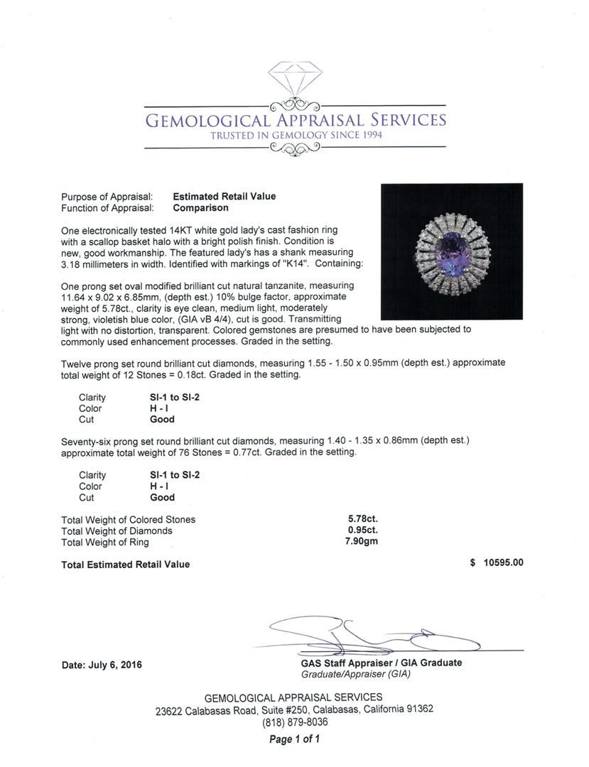 One electronically tested 14KT white gold lady's cast fashion ring with a scallop basket halo with a bright polish finish. The featured lady's has a shank measuring 3.18 millimeters in width. Identified with markings of "K14". Condition is new, good workmanship. Containing: One prong set oval modified brilliant cut natural tanzanite, measuring 11.64 x 9.02 x 6.85mm, (depth est.) 10%. bulge factor, approximate weight of 5.78ct., clarity is eye clean, medium light, moderately strong, violetish blue color, (GIA vB 4/4), cut is good. Transmitting light with no distortion, transparent. Colored gemstones are presumed to have been subjected to commonly used enhancement processes. Graded in the setting. Twelve prong set round brilliant cut diamonds, measuring 1.55 - 1.50 x 0.95mm (depth est.) approximate total weight of 12 Stones = 0.18ct. Graded in the setting. Clarity: SI-1 to SI-2. Color: H - I. Cut Good Seventy-Six prong set round brilliant cut diamonds, measuring 1.40 - 1.35 x 0.86mm (depth est.) approximate total weight of 76 Stones = 0.77ct. Graded in the setting. Clarity: SI-1 to SI-2. Color: H - I. Cut Good. Total Weight of Colored Stones 5.78ct. Total Weight of Diamonds 0.95ct. Total Weight of Ring 7.90gm. GAS Appraised.