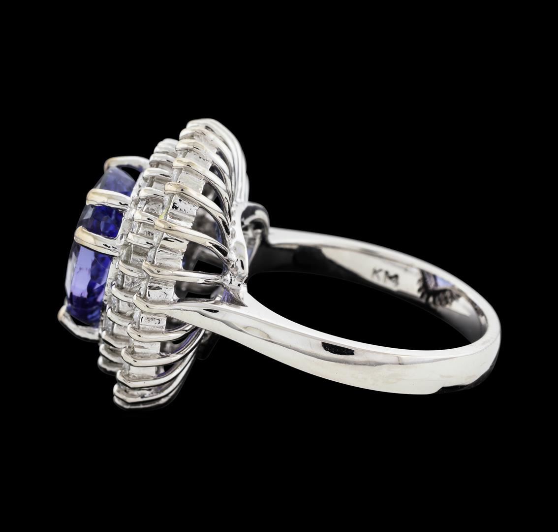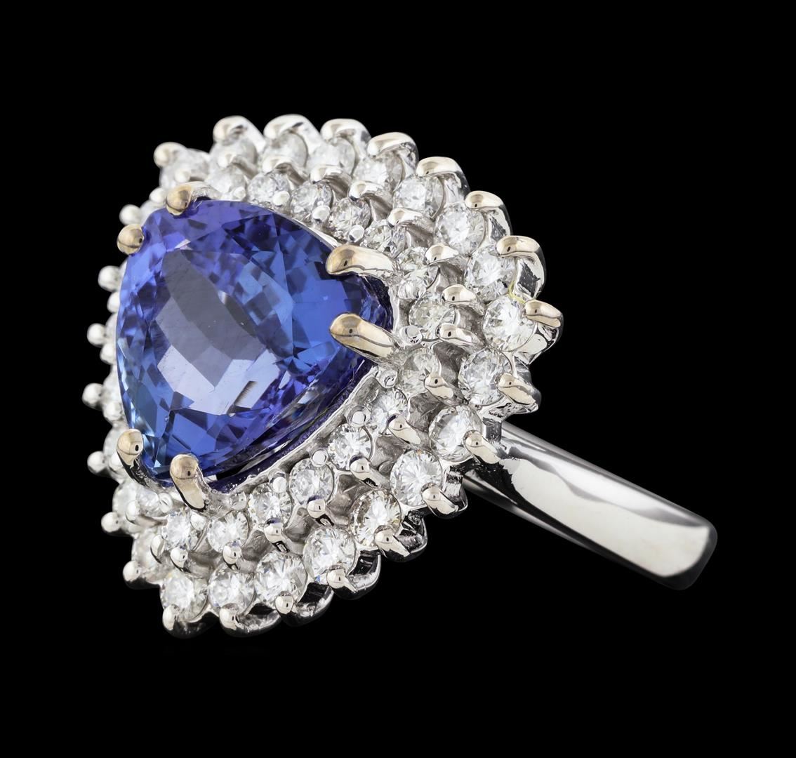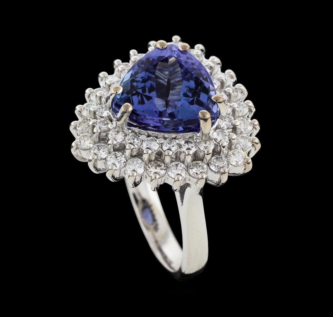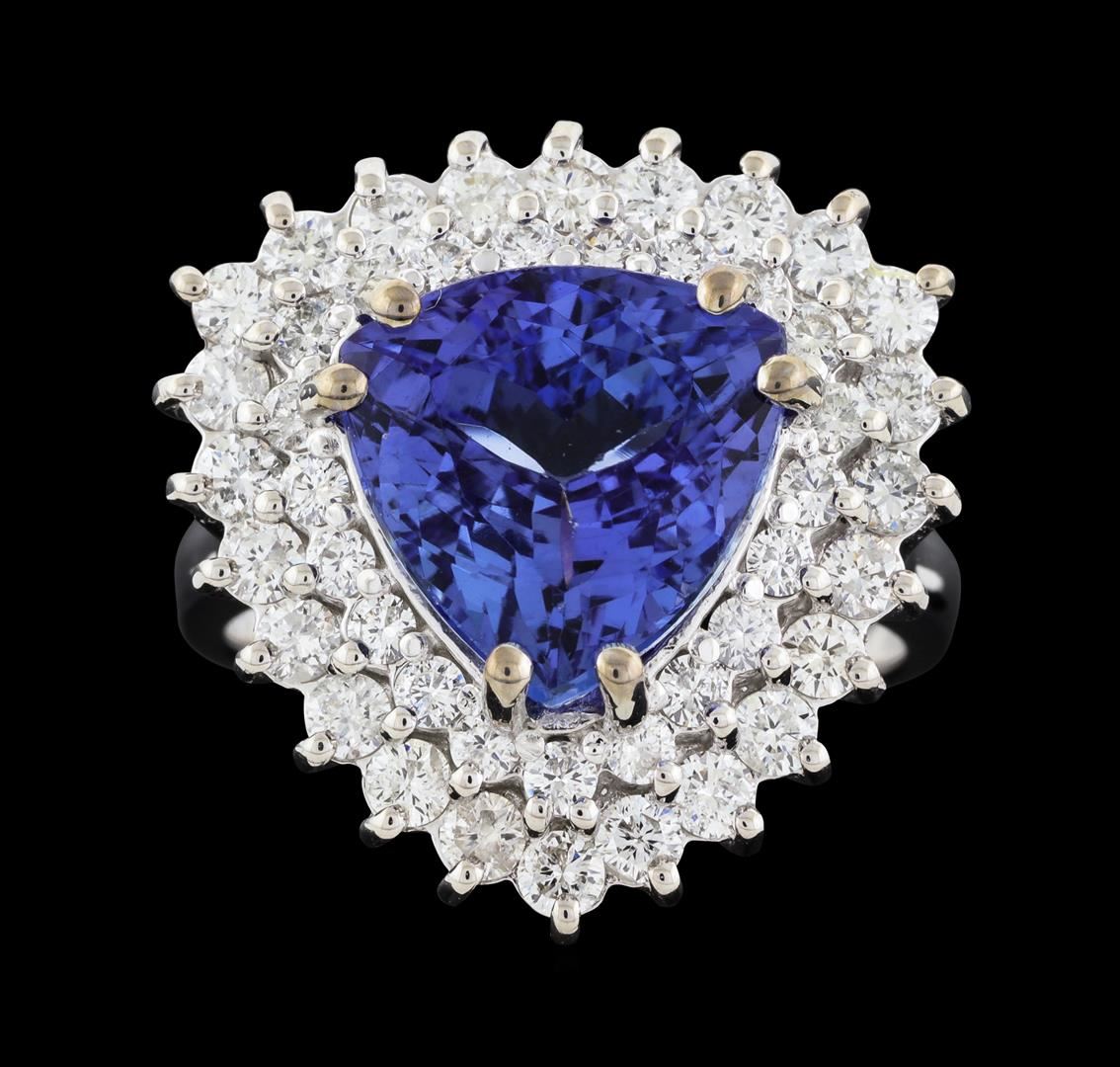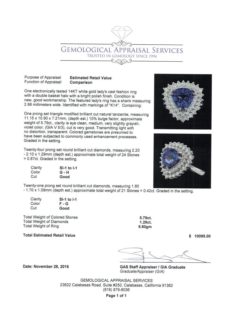 One electronically tested 14KT white gold lady's cast fashion ring with a double basket halo with a bright polish finish. The featured lady's ring has a shank measuring 2.88 millimeters wide. Identified with markings of 'K14'. Condition is new, good workmanship. Containing: One prong set triangle modified brilliant cut natural tanzanite, measuring 11.15 x 10.90 x 7.21mm, (depth est.) 10%. bulge factor, approximate weight of 5.79ct., clarity is eye clean, medium, very slightly grayish, violet color, (GIA V 5/3), cut is very good. Transmitting light with no distortion, transparent. Colored gemstones are presumed to have been subjected to commonly used enhancement processes. Graded in the setting. Twenty-Four prong set round brilliant cut diamonds, measuring 2.20 - 2.10 x 1.29mm (depth est.) approximate total weight of 24 Stones = 0.87ct. Graded in the setting. Clarity SI-1 to I-1. Color: G - H Cut Good Twenty-One prong set round brilliant cut diamonds, measuring 1.80 - 1.70 x 1.09mm (depth est.) approximate total weight of 21 Stones = 0.42ct. Graded in the setting. Clarity SI-1 to I-1. Color: F - G Cut Good. Total Weight of Colored Stones 5.79ct.. Total Weight of Diamonds 1.29ct.. Total Weight of Ring 9.80gm. GAS Appraised at $10,095.00.