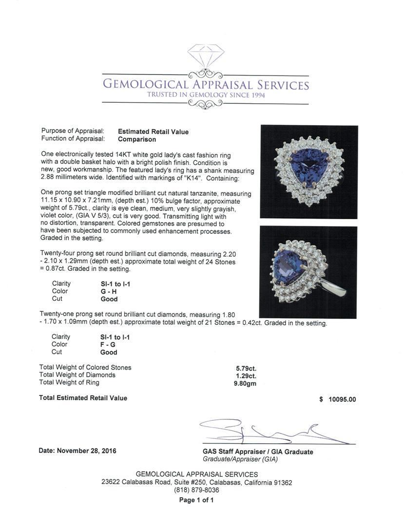 One electronically tested 14KT white gold lady's cast fashion ring with a double basket halo with a bright polish finish. The featured lady's ring has a shank measuring 2.88 millimeters wide. Identified with markings of 'K14'. Condition is new, good workmanship. Containing: One prong set triangle modified brilliant cut natural tanzanite, measuring 11.15 x 10.90 x 7.21mm, (depth est.) 10%. bulge factor, approximate weight of 5.79ct., clarity is eye clean, medium, very slightly grayish, violet color, (GIA V 5/3), cut is very good. Transmitting light with no distortion, transparent. Colored gemstones are presumed to have been subjected to commonly used enhancement processes. Graded in the setting. Twenty-Four prong set round brilliant cut diamonds, measuring 2.20 - 2.10 x 1.29mm (depth est.) approximate total weight of 24 Stones = 0.87ct. Graded in the setting. Clarity SI-1 to I-1. Color: G - H Cut Good Twenty-One prong set round brilliant cut diamonds, measuring 1.80 - 1.70 x 1.09mm (depth est.) approximate total weight of 21 Stones = 0.42ct. Graded in the setting. Clarity SI-1 to I-1. Color: F - G Cut Good. Total Weight of Colored Stones 5.79ct.. Total Weight of Diamonds 1.29ct.. Total Weight of Ring 9.80gm. GAS Appraised.