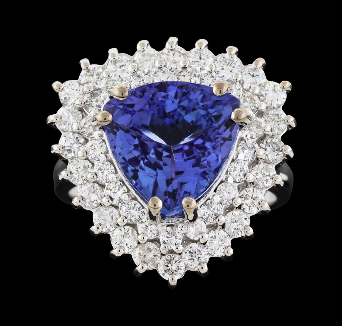 One electronically tested 14KT white gold lady's cast fashion ring with a double basket halo with a bright polish finish. The featured lady's ring has a shank measuring 2.88 millimeters wide. Identified with markings of 'K14'. Condition is new, good workmanship. Containing: One prong set triangle modified brilliant cut natural tanzanite, measuring 11.15 x 10.90 x 7.21mm, (depth est.) 10%. bulge factor, approximate weight of 5.79ct., clarity is eye clean, medium, very slightly grayish, violet color, (GIA V 5/3), cut is very good. Transmitting light with no distortion, transparent. Colored gemstones are presumed to have been subjected to commonly used enhancement processes. Graded in the setting. Twenty-Four prong set round brilliant cut diamonds, measuring 2.20 - 2.10 x 1.29mm (depth est.) approximate total weight of 24 Stones = 0.87ct. Graded in the setting. Clarity SI-1 to I-1. Color: G - H Cut Good Twenty-One prong set round brilliant cut diamonds, measuring 1.80 - 1.70 x 1.09mm (depth est.) approximate total weight of 21 Stones = 0.42ct. Graded in the setting. Clarity SI-1 to I-1. Color: F - G Cut Good. Total Weight of Colored Stones 5.79ct.. Total Weight of Diamonds 1.29ct.. Total Weight of Ring 9.80gm. GAS Appraised.