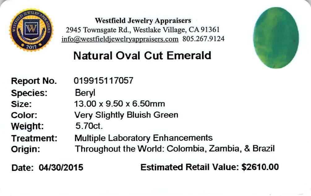 One oval mixed cut natural emerald exact weight 5.70ct., clarity is heavily included, type III, medium dark, very slightly grayish, very slightly bluish green color, (GIA vslbG 6/3), cut is good. Westfield Appraised at $2,610.00.
