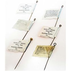 Small flags that have information on the back of some and others "Try Quality Bread Above Them All Wagner Baking Co."
