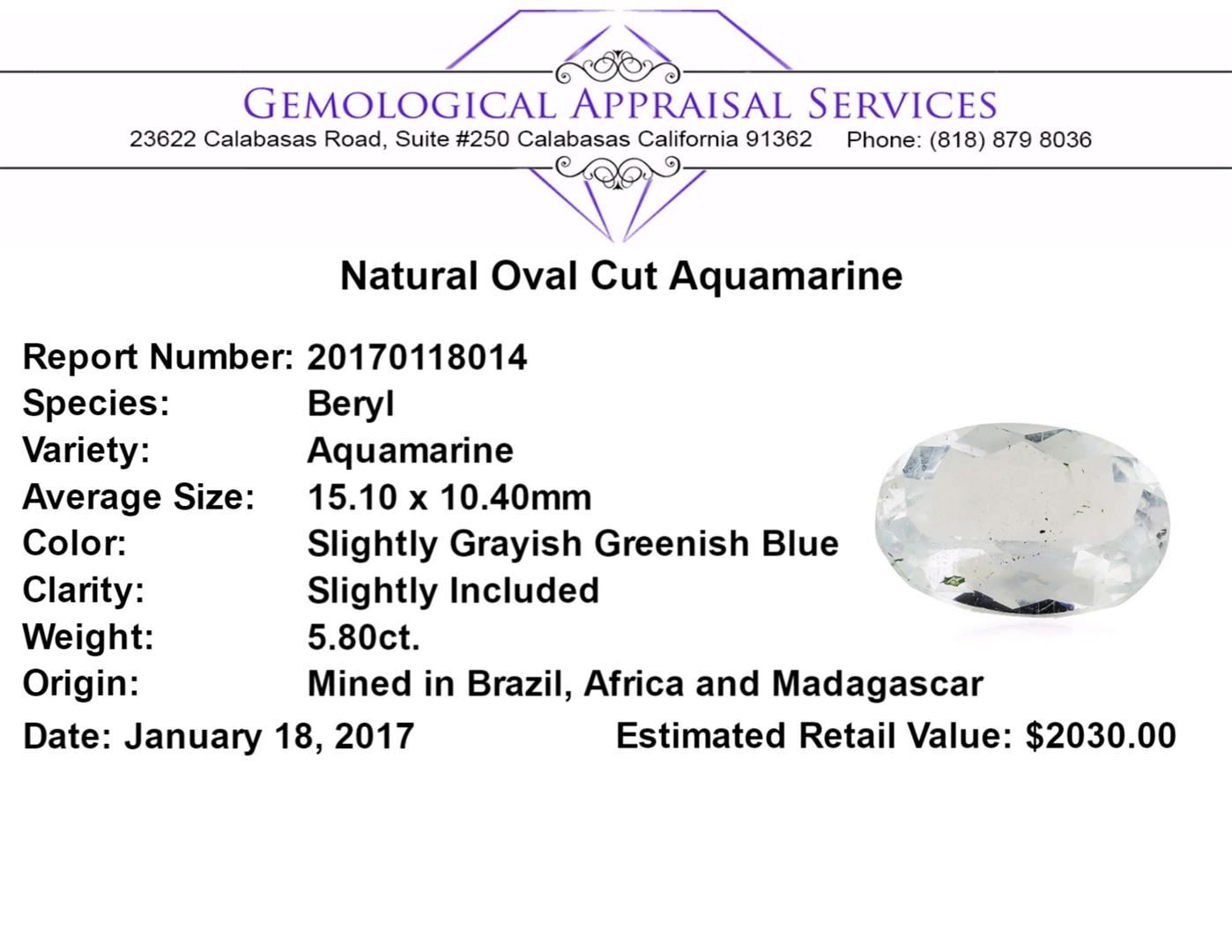 One natural oval cut aquamarine with an exact weight of 5.80ct., clarity is slightly included, slightly grayish greenish blue. Gemological Appraisals Services estimates the retail value at $2030 GAS Appraised.