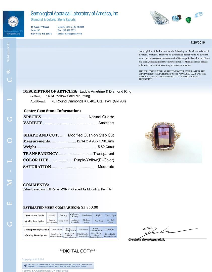 One lady's ametrine and diamond ring. Setting: 14KT yellow gold mounting. Additional: 70 round diamonds = 0.40ct. TWT (G-H/SI). Center Gem Stone Information: Species: Natural Quartz. Variety: Ametrine. Shape and Cut: Modified Cushion Step Cut. Measurements: 12.14 x 9.98 x 5.90mm. Weight: 5.80ct. Transparency: Transparent. Color Hue: Purple/Yellow (Bi-Color). Saturation: Moderate. Total Weight: 2.87 grams.