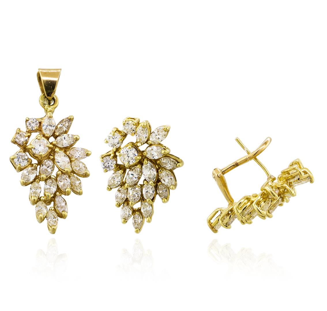 One set electronically tested 14KT yellow gold lady's combination cast & assembled fashion pendant and earrings with Omega clip backs with a bright polish finish. Identified with markings of "14K". Condition is used, good workmanship. Containing: Twelve prong set round brilliant cut diamonds, measuring 4.00 - 2.95 x 2.09mm (depth est.) approximate total weight of 12 Stones = 1.80ct. Graded in the setting. Clarity: SI-1 to SI-2. Color: I - J. Cut Good Forty-Five prong set marquise shaped cut diamonds, measuring 4.50 x 2.35 x 1.48mm (depth est.) approximate total weight of 45 Stones = 4.00ct. Graded in the setting. Clarity: SI-1 to SI-2. Color: I - K. Cut Good. Total Weight of Diamonds 5.80ct. Total Weight of Pendant And Earrings 13.40gm. GAS Appraised at $14,610.00.