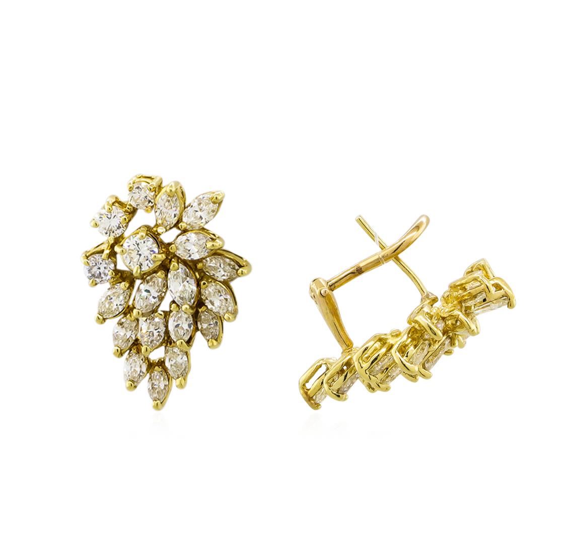 One set electronically tested 14KT yellow gold lady's combination cast & assembled fashion pendant and earrings with Omega clip backs with a bright polish finish. Identified with markings of "14K". Condition is used, good workmanship. Containing: Twelve prong set round brilliant cut diamonds, measuring 4.00 - 2.95 x 2.09mm (depth est.) approximate total weight of 12 Stones = 1.80ct. Graded in the setting. Clarity: SI-1 to SI-2. Color: I - J. Cut Good Forty-Five prong set marquise shaped cut diamonds, measuring 4.50 x 2.35 x 1.48mm (depth est.) approximate total weight of 45 Stones = 4.00ct. Graded in the setting. Clarity: SI-1 to SI-2. Color: I - K. Cut Good. Total Weight of Diamonds 5.80ct. Total Weight of Pendant And Earrings 13.40gm. GAS Appraised at $14,610.00.
