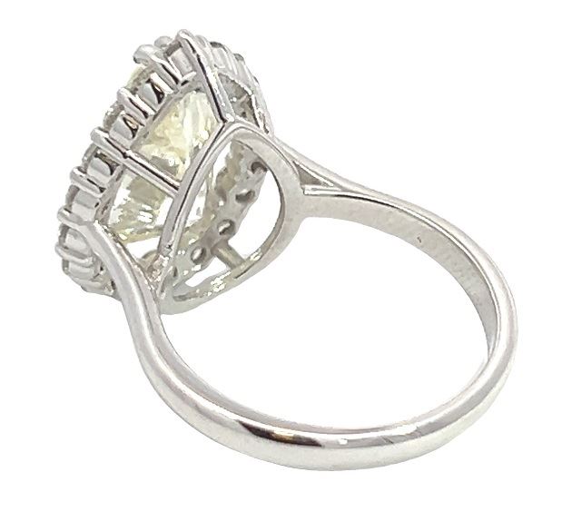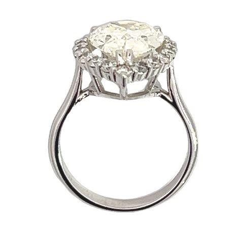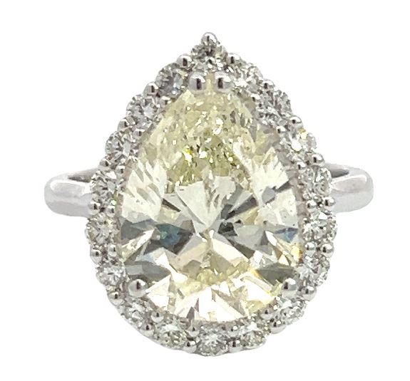 One electronically tested 14KT white gold lady's cast tear drop wedding ring with a basket halo with a bright polish finish. The featured lady's ring has a shank measuring 2.60 millimeters wide. Identified with markings of "14K". Condition is new, good workmanship. Containing: One prong set pear shaped cut diamond, measuring 14.09 x 10.07 x 6.09mm (depth est.) approximate weight of 5.00ct. Graded loose prior to setting in the EGL US Laboratory, laser inscribed Report #US923237203D. Color J Clarity SI Cut Very Good Eighteen prong set round brilliant cut diamonds, measuring 2.30 - 2.25 x 1.41mm (depth est.) approximate total weight of 18 Stones = 0.80ct. Graded in the setting. Color G - H Clarity VS-1 to SI-1 Cut Very Good Total Weight of Diamonds 5.80ct. Total Weight of Wedding Ring 5.40gm Estimated Retail Value $ 108365.00