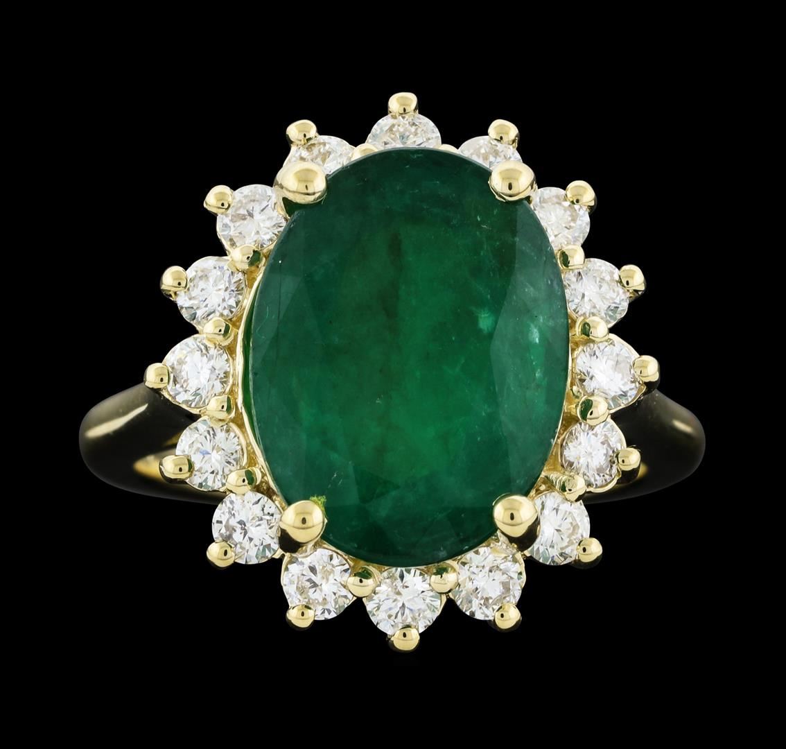 One electronically tested 14KT yellow gold lady's cast fashion ring with a cathedral shank with a basket halo with a bright polish finish. The featured lady's ring has a shank measuring 1.91 millimeters wide. Identified with markings of '14K'. Condition is new, good workmanship. Containing: One prong set oval modified mixed cut natural emerald, measuring 13.75 x 10.32 x 6.30mm, (depth est.) 14%. bulge factor, approximate weight of 5.80ct., clarity is heavily included, medium dark, moderately strong, green color, (GIA G 6/4), cut is good. Transmitting light somewhat diffusely, semi-transparent to translucent. Indications of oil residue. Naturally occurring internal & external characteristics are present. Colored gemstones are presumed to have been subjected to commonly used enhancement processes. Graded in the setting. Sixteen prong set round brilliant cut diamonds, measuring 2.40 - 2.30 x 1.46mm (depth est.) approximate total weight of 16 Stones = 0.80ct. Graded in the setting. Clarity SI-1 to SI-3. Color: H - I Cut Good. Total Weight of Colored Stones 5.80ct.. Total Weight of Diamonds 0.80ct.. Total Weight of Ring 6.30gm. GAS Appraised at $8,805.00.