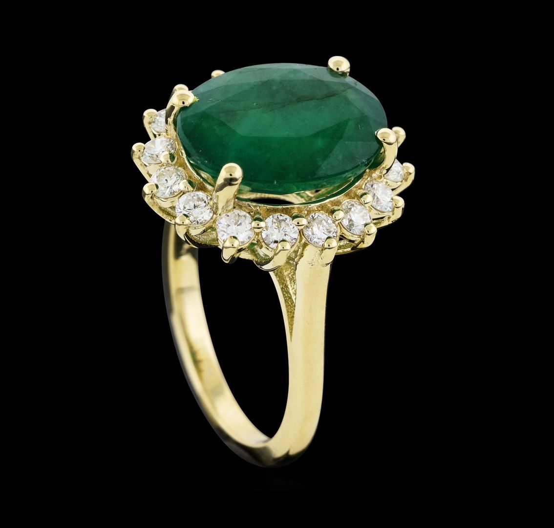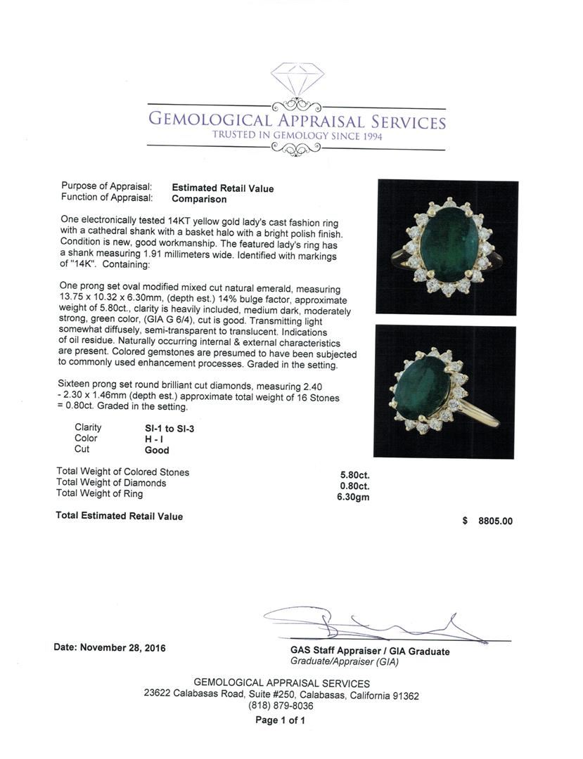One electronically tested 14KT yellow gold lady's cast fashion ring with a cathedral shank with a basket halo with a bright polish finish. The featured lady's ring has a shank measuring 1.91 millimeters wide. Identified with markings of '14K'. Condition is new, good workmanship. Containing: One prong set oval modified mixed cut natural emerald, measuring 13.75 x 10.32 x 6.30mm, (depth est.) 14%. bulge factor, approximate weight of 5.80ct., clarity is heavily included, medium dark, moderately strong, green color, (GIA G 6/4), cut is good. Transmitting light somewhat diffusely, semi-transparent to translucent. Indications of oil residue. Naturally occurring internal & external characteristics are present. Colored gemstones are presumed to have been subjected to commonly used enhancement processes. Graded in the setting. Sixteen prong set round brilliant cut diamonds, measuring 2.40 - 2.30 x 1.46mm (depth est.) approximate total weight of 16 Stones = 0.80ct. Graded in the setting. Clarity SI-1 to SI-3. Color: H - I Cut Good. Total Weight of Colored Stones 5.80ct.. Total Weight of Diamonds 0.80ct.. Total Weight of Ring 6.30gm. GAS Appraised at $8,805.00.