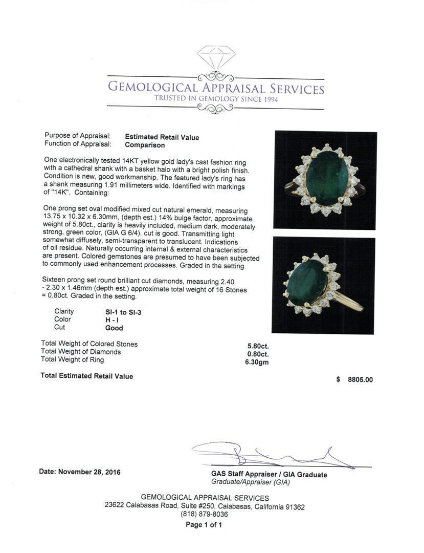 One electronically tested 14KT yellow gold lady's cast fashion ring with a cathedral shank with a basket halo with a bright polish finish. The featured lady's ring has a shank measuring 1.91 millimeters wide. Identified with markings of '14K'. Condition is new, good workmanship. Containing: One prong set oval modified mixed cut natural emerald, measuring 13.75 x 10.32 x 6.30mm, (depth est.) 14%. bulge factor, approximate weight of 5.80ct., clarity is heavily included, medium dark, moderately strong, green color, (GIA G 6/4), cut is good. Transmitting light somewhat diffusely, semi-transparent to translucent. Indications of oil residue. Naturally occurring internal & external characteristics are present. Colored gemstones are presumed to have been subjected to commonly used enhancement processes. Graded in the setting. Sixteen prong set round brilliant cut diamonds, measuring 2.40 - 2.30 x 1.46mm (depth est.) approximate total weight of 16 Stones = 0.80ct. Graded in the setting. Clarity SI-1 to SI-3. Color: H - I Cut Good. Total Weight of Colored Stones 5.80ct.. Total Weight of Diamonds 0.80ct.. Total Weight of Ring 6.30gm. GAS Appraised.