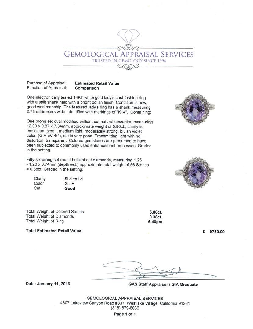 One electronically tested 14KT white gold lady's cast fashion ring with a split shank halo with a bright polish finish. The featured lady's ring has a shank measuring 2.78 millimeters wide. Identified with markings of "K14". Condition is new, good workmanship. Containing: One prong set oval modified brilliant cut natural tanzanite, measuring 12.00 x 9.87 x 7.34mm, approximate weight of 5.80ct., clarity is eye clean, type I, medium light, moderately strong, bluish violet color, (GIA bV 4/4), cut is very good. Transmitting light with no distortion, transparent. Colored gemstones are presumed to have been subjected to commonly used enhancement processes. Graded in the setting. Fifty-Six prong set round brilliant cut diamonds, measuring 1.25 - 1.20 x 0.74mm (depth est.) approximate total weight of 56 Stones = 0.38ct. Graded in the setting. Clarity: SI-1 to I-1. Color: G - Good. Total Weight of Colored Stones 5.80ct. Total Weight of Diamonds 0.38ct. Total Weight of Ring 6.40gm. GAS Appraised at $9,750.00.