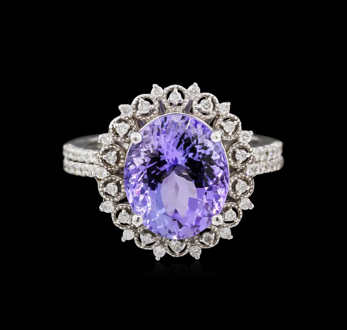 One electronically tested 14KT white gold lady's cast fashion ring with a split shank halo with a bright polish finish. The featured lady's ring has a shank measuring 2.78 millimeters wide. Identified with markings of "K14". Condition is new, good workmanship. Containing: One prong set oval modified brilliant cut natural tanzanite, measuring 12.00 x 9.87 x 7.34mm, approximate weight of 5.80ct., clarity is eye clean, type I, medium light, moderately strong, bluish violet color, (GIA bV 4/4), cut is very good. Transmitting light with no distortion, transparent. Colored gemstones are presumed to have been subjected to commonly used enhancement processes. Graded in the setting. Fifty-Six prong set round brilliant cut diamonds, measuring 1.25 - 1.20 x 0.74mm (depth est.) approximate total weight of 56 Stones = 0.38ct. Graded in the setting. Clarity: SI-1 to I-1. Color: G - Good. Total Weight of Colored Stones 5.80ct. Total Weight of Diamonds 0.38ct. Total Weight of Ring 6.40gm. GAS Appraised at $9,750.00.
