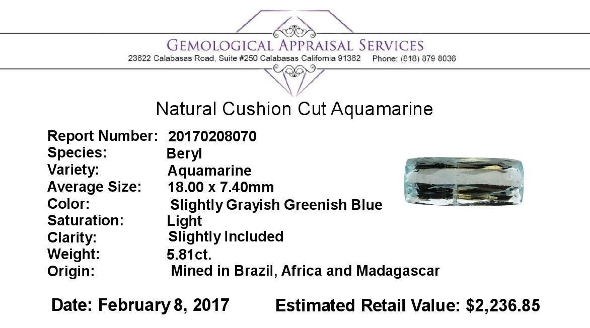One natural cushion cut aquamarine with an exact weight of 5.81ct., clarity is slightly included, slightly grayish greenish blue, light. Gemological Appraisals Services estimates the retail value at $2236.85 GAS Appraised.