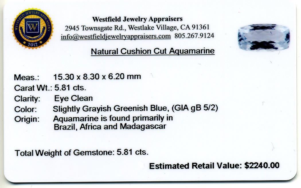 5.81ct Cushion Cut Natural Cushion Cut Aquamarine. Westfield Appraised at $2,240.00.