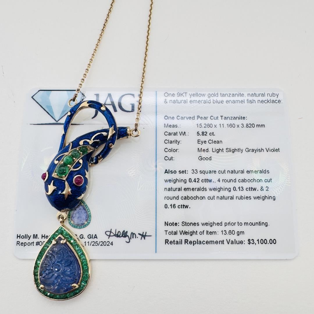 This artistic 9KT yellow gold tanzanite, natural ruby, and natural emerald blue enamel fish necklace showcases one carved pear cut tanzanite measuring 15.260 x 11.160 x 3.820 mm, weighing 5.82 ct, with eye clean clarity and medium light slightly grayish violet color, exhibiting a Good cut. Also set are 33 square cut natural emeralds weighing 0.42 cttw, 4 round cabochon cut natural emeralds weighing 0.13 cttw, and 2 round cabochon cut natural rubies weighing 0.16 cttw. The total item weight is 13.60 gm.
