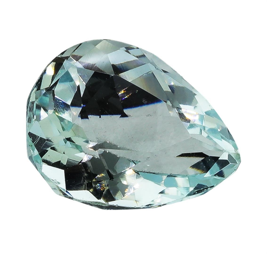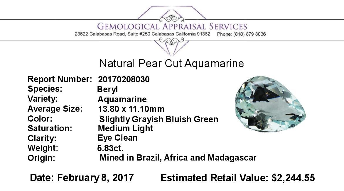 One natural pear cut aquamarine with an exact weight of 5.83ct., clarity is eye clean, slightly grayish bluish green, medium light. Gemological Appraisals Services estimates the retail value at $2244.55 GAS Appraised.