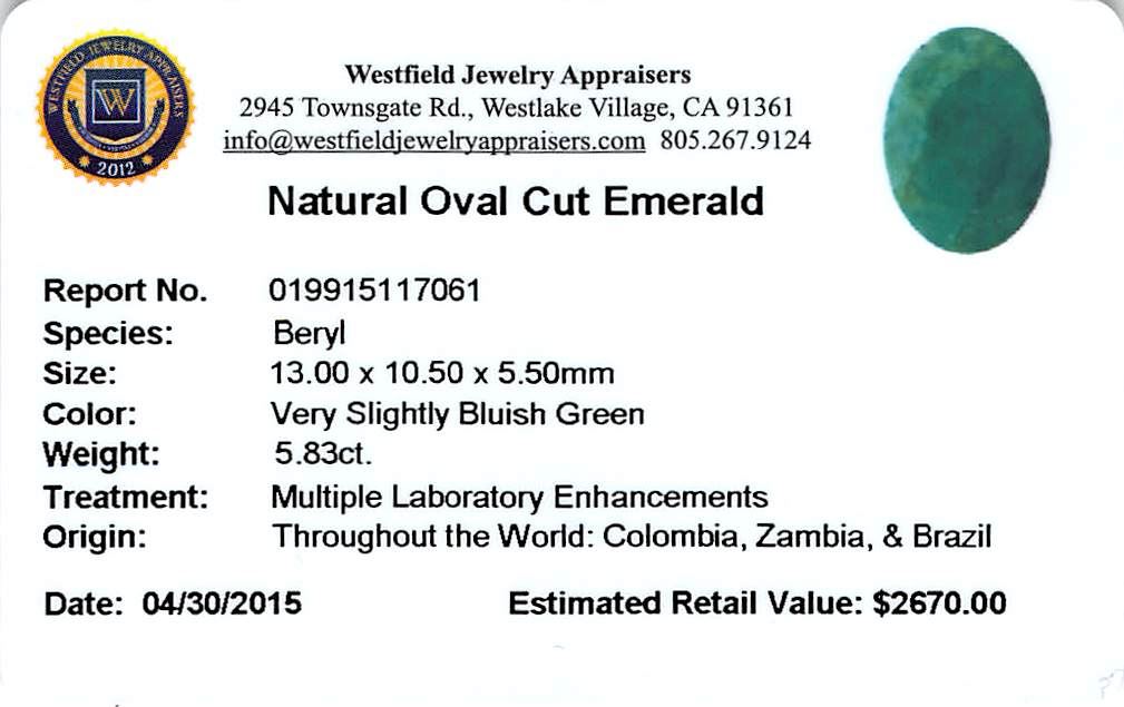 One oval mixed cut natural emerald exact weight 5.83ct., clarity is heavily included, type III, medium dark, very slightly grayish, very slightly bluish green color, (GIA vslbG 6/3), cut is good. Westfield Appraised at $2,670.00.
