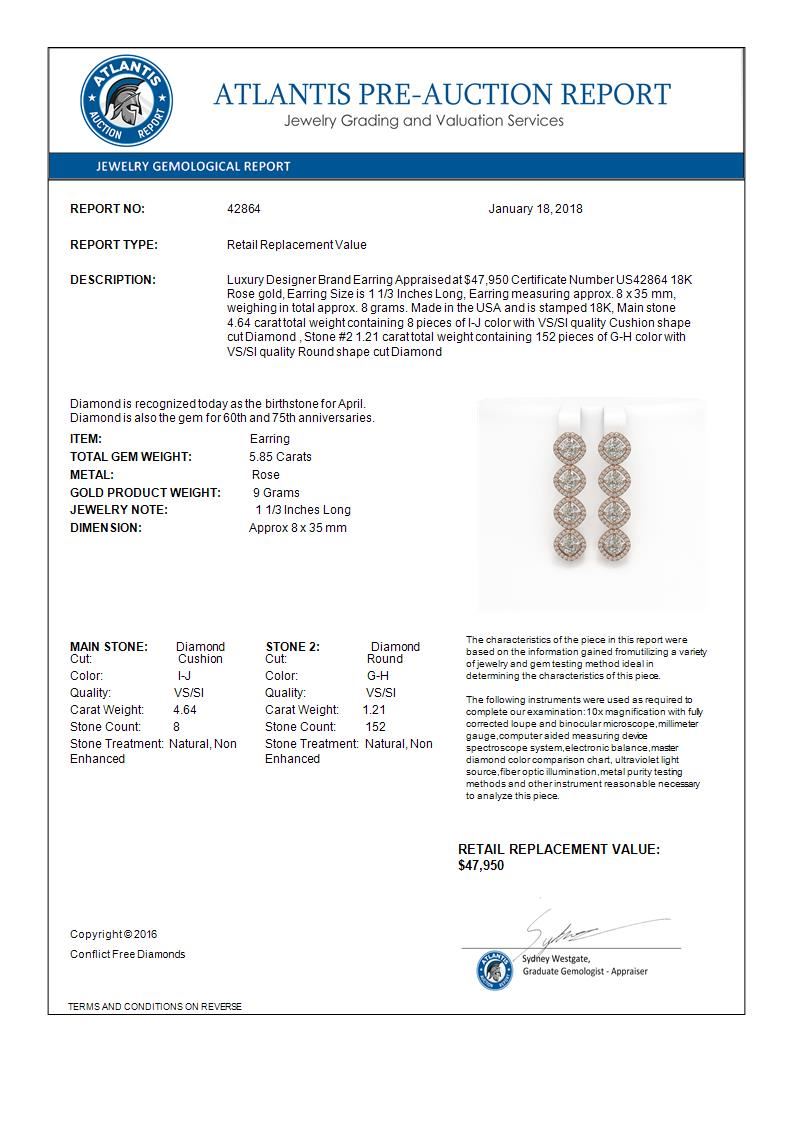 REF-1090Y2K -42864 ---- 5.85 CTW Cushion Cut Diamond Designer Earrings 18K Rose Gold ---- Luxury Designer Brand Earring Appraised at $47,950 Certificate Number US42864 18K Rose gold, Earring Size is 1 1/3 Inches Long, Earring measuring approx. 8 x 35 mm, weighing in total approx. 8 grams. Made in the USA and is stamped 18K, Main stone 4.64 carat total weight containing 8 pieces of I-J color with VS/SI quality Cushion shape cut Diamond , Stone #2 1.21 carat total weight containing 152 pieces of G-H color with VS/SI quality Round shape cut Diamond