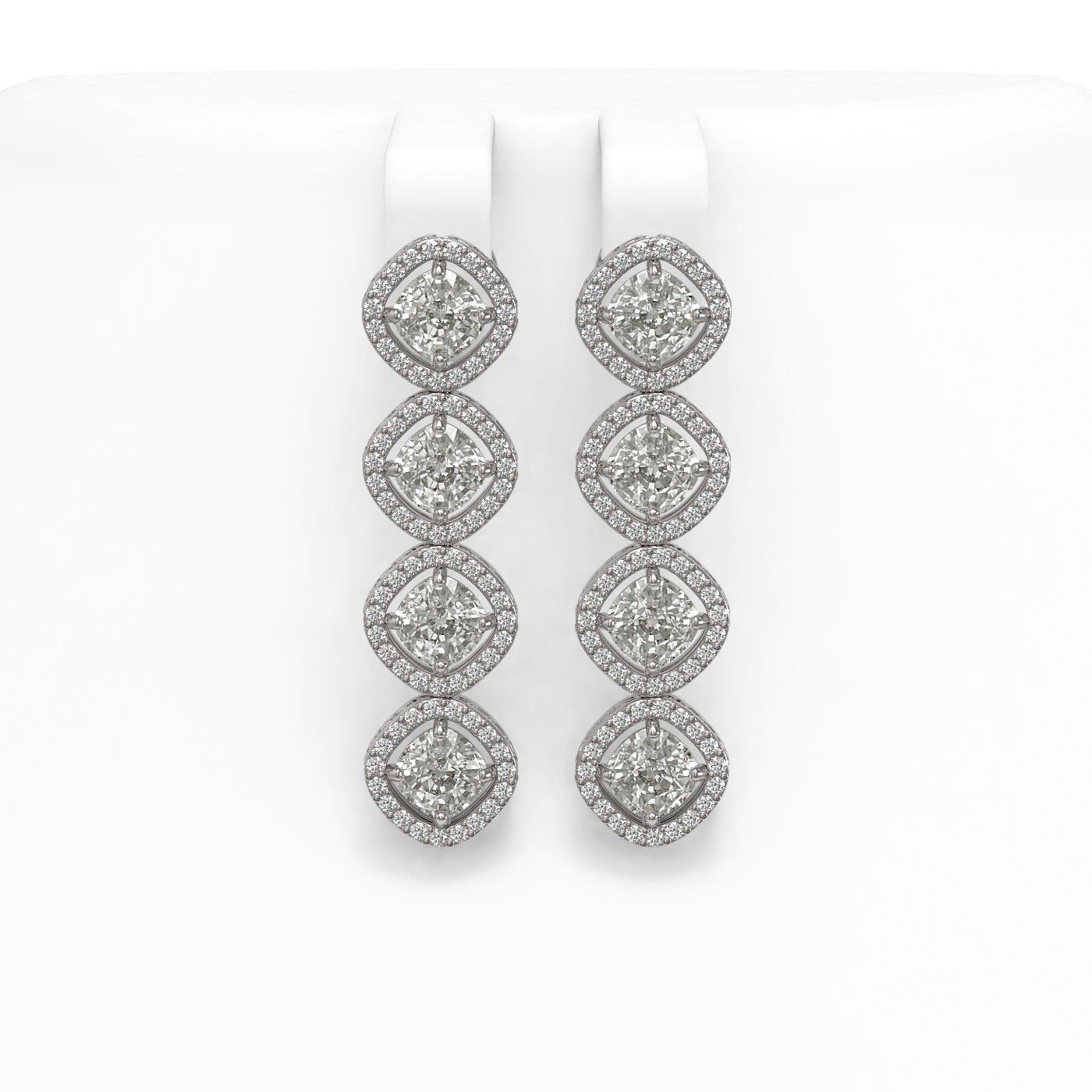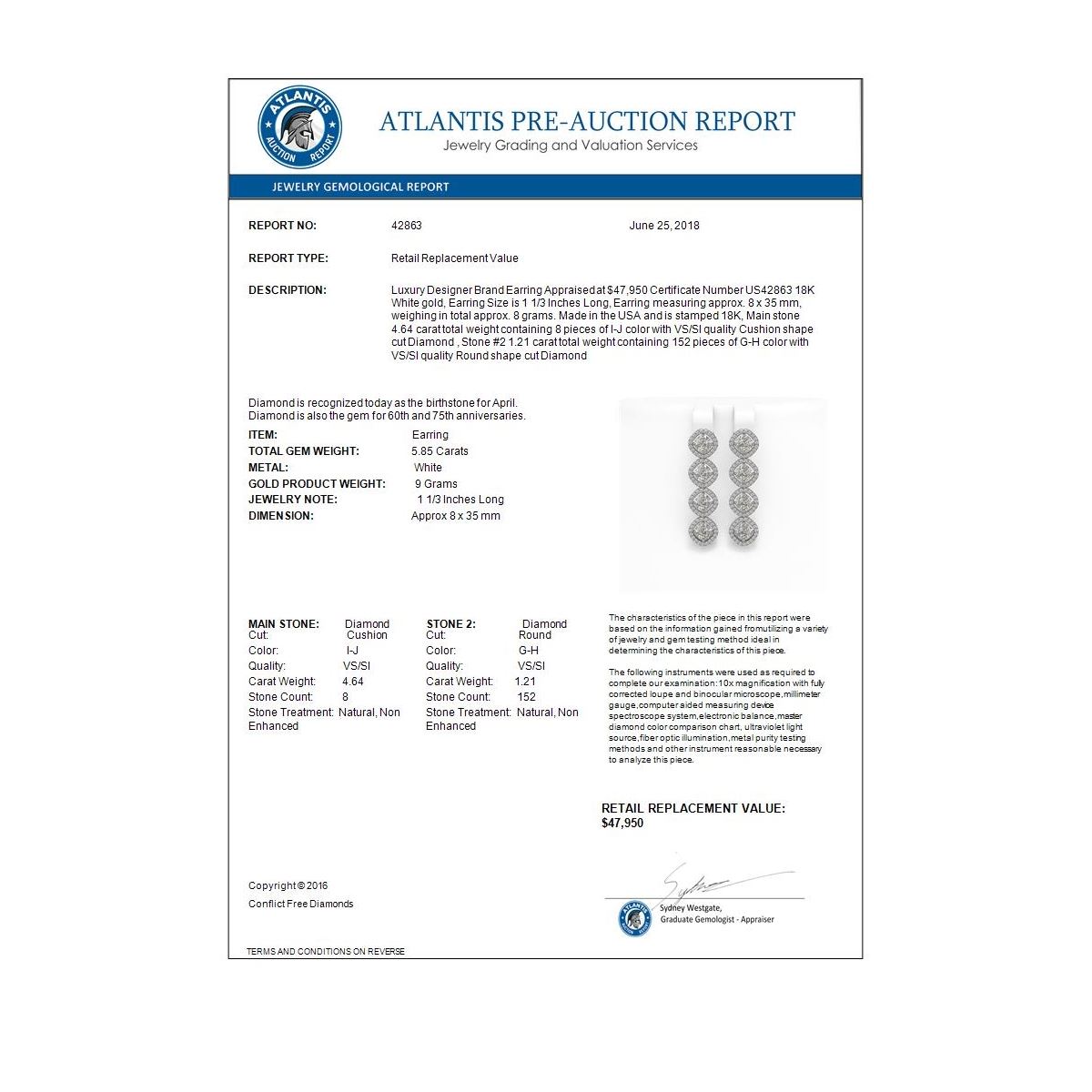 REF-1090F2N -42863 ---- 5.85 CTW Cushion Cut Diamond Designer Earrings 18K White Gold ---- Luxury Designer Brand Earring Appraised at $47,950 Certificate Number US42863 18K White gold, Earring Size is 1 1/3 Inches Long, Earring measuring approx. 8 x 35 mm, weighing in total approx. 8 grams. Made in the USA and is stamped 18K, Main stone 4.64 carat total weight containing 8 pieces of I-J color with VS/SI quality Cushion shape cut Diamond , Stone #2 1.21 carat total weight containing 152 pieces of G-H color with VS/SI quality Round shape cut Diamond