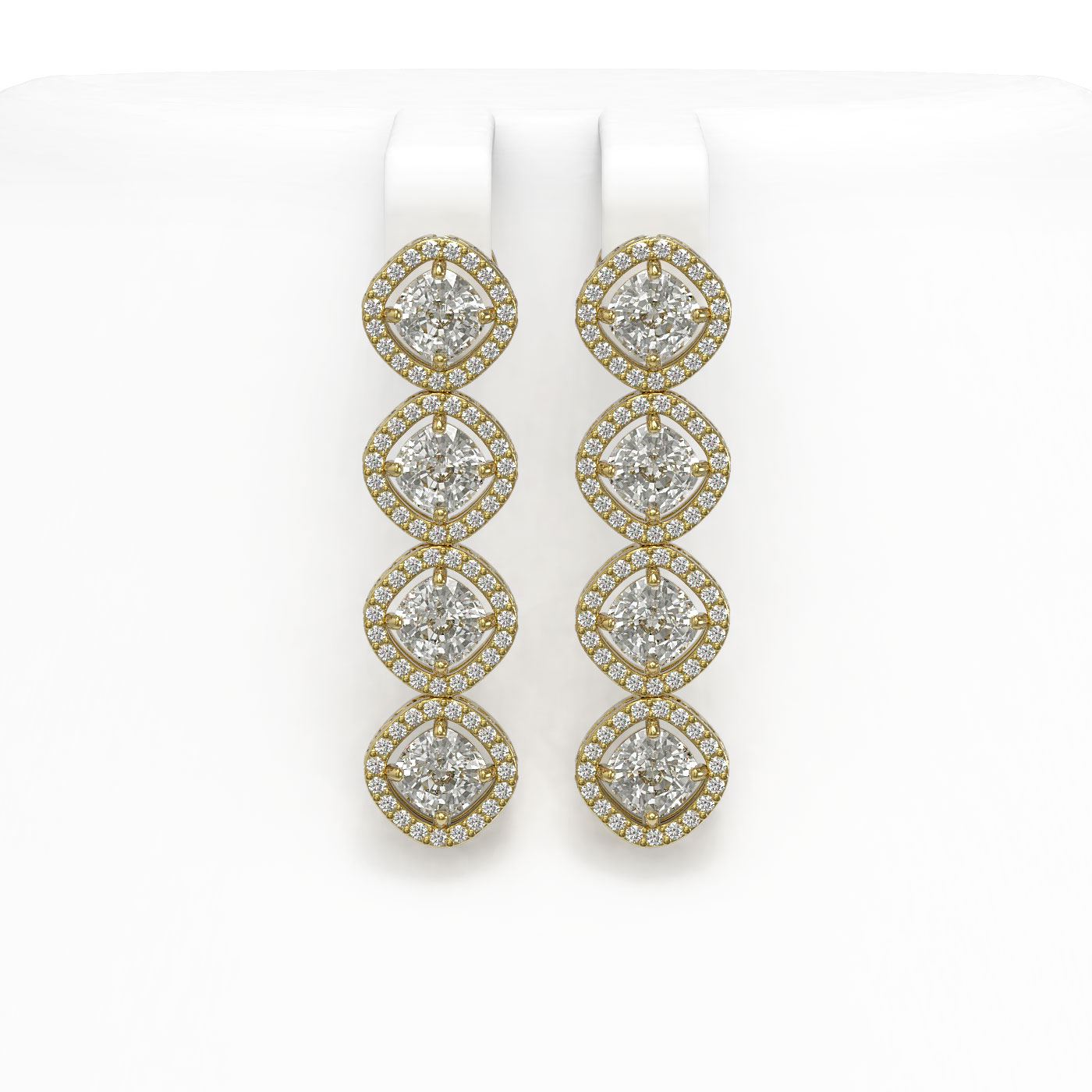 REF-1090K2W -42865 ---- 5.85 CTW Cushion Cut Diamond Designer Earrings 18K Yellow Gold ---- Luxury Designer Brand Earring Appraised at $47,950 Certificate Number US42865 18K Yellow gold, Earring Size is 1 1/3 Inches Long, Earring measuring approx. 8 x 35 mm, weighing in total approx. 8 grams. Made in the USA and is stamped 18K, Main stone 4.64 carat total weight containing 8 pieces of I-J color with VS/SI quality Cushion shape cut Diamond , Stone #2 1.21 carat total weight containing 152 pieces of G-H color with VS/SI quality Round shape cut Diamond