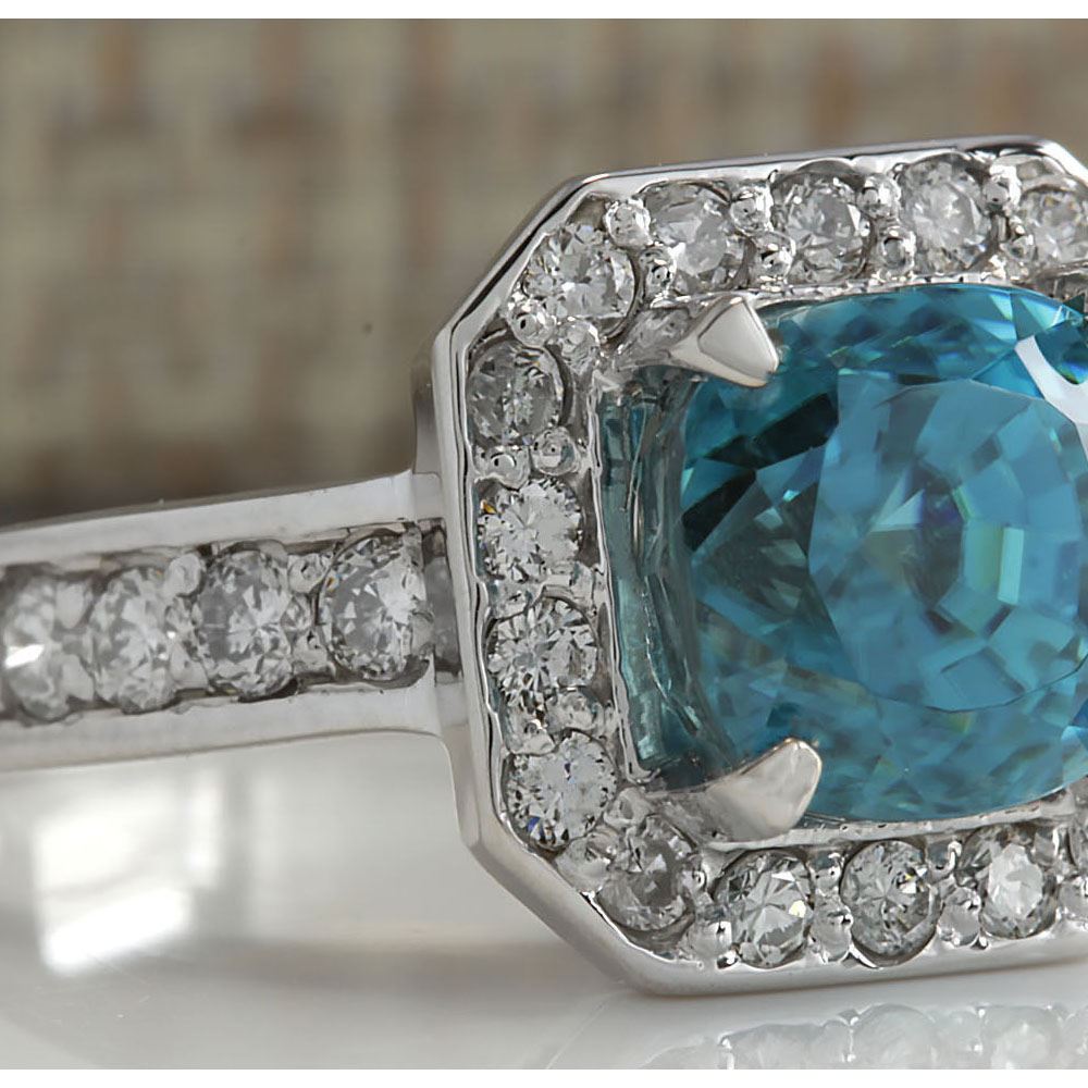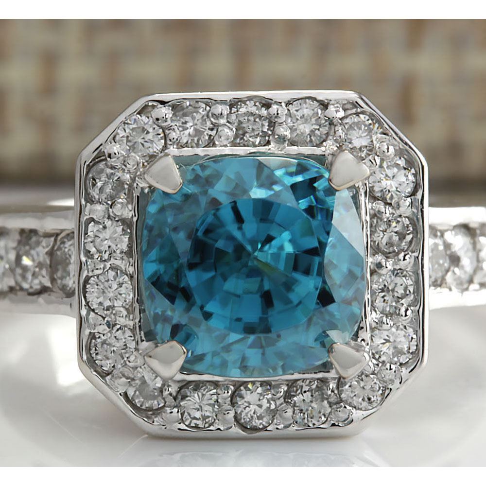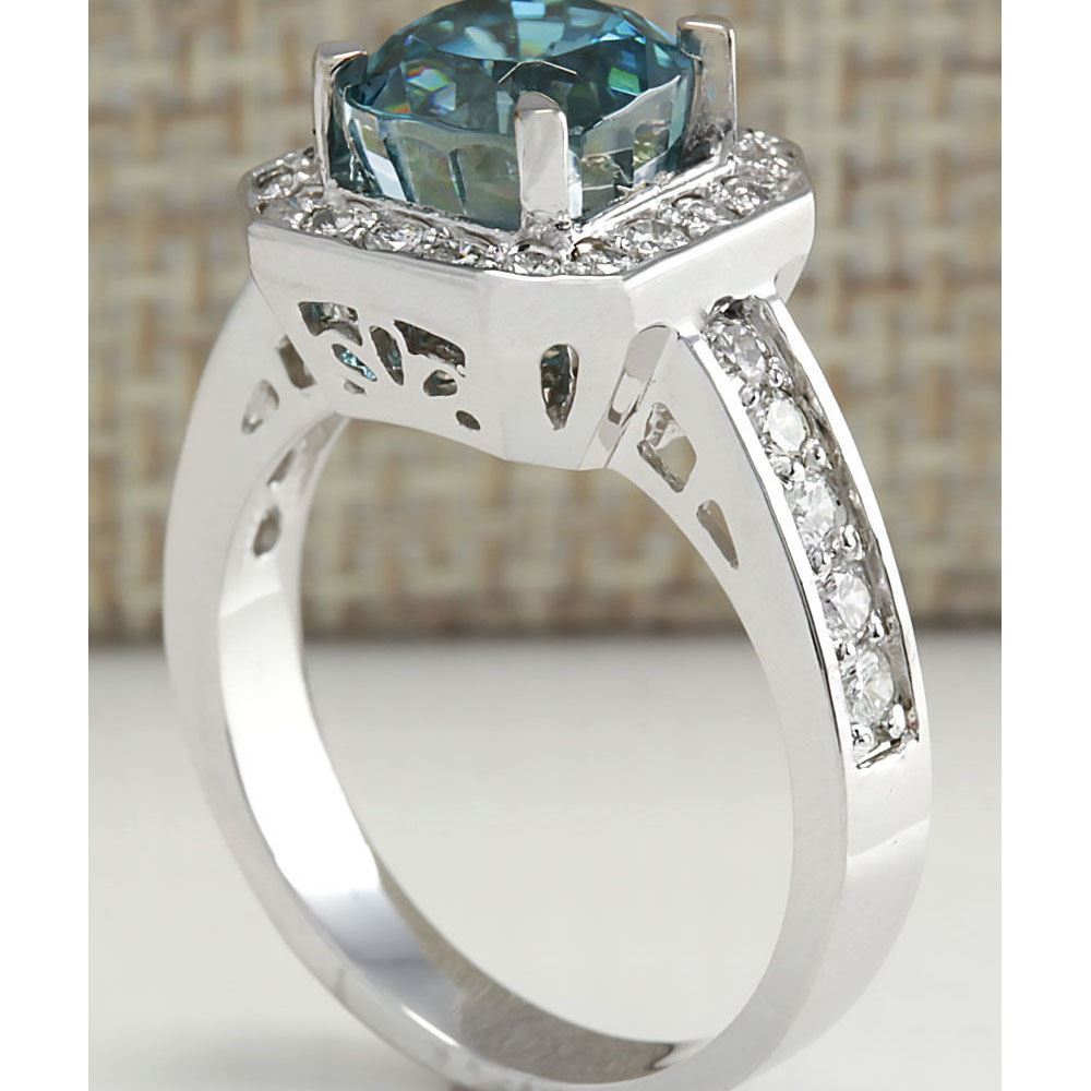 5.85 CTW Natural Blue Zircon And Diamond Ring 14K Solid White Gold