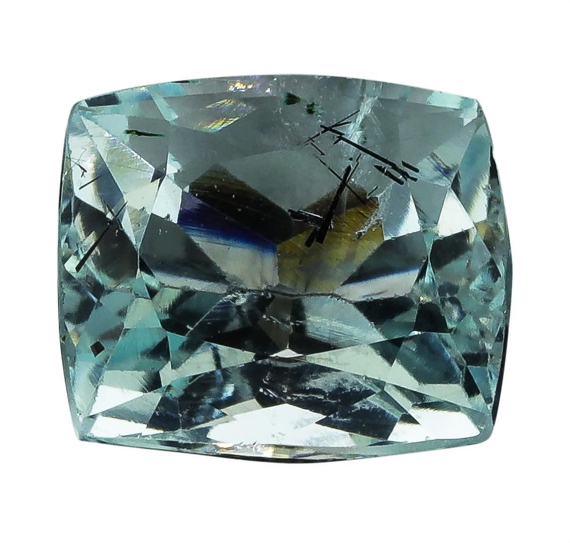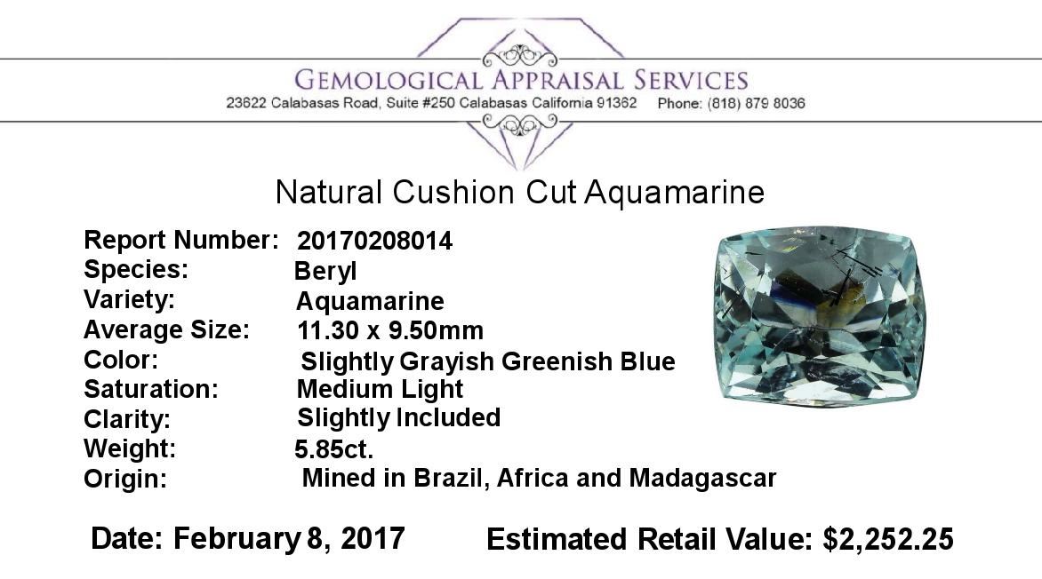 One natural cushion cut aquamarine with an exact weight of 5.85ct., clarity is slightly included, slightly grayish greenish blue, medium light. Gemological Appraisals Services estimates the retail value at $2252.25 GAS Appraised.