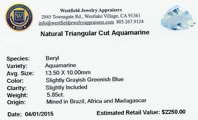 One triangle cut natural aquamarine exact weight 5.85ct., clarity is slightly included, type I, medium, very slightly grayish, very slightly greenish blue color, (GIA vslgB 5/3), cut is good. Westfield Appraised at $2,250.00.