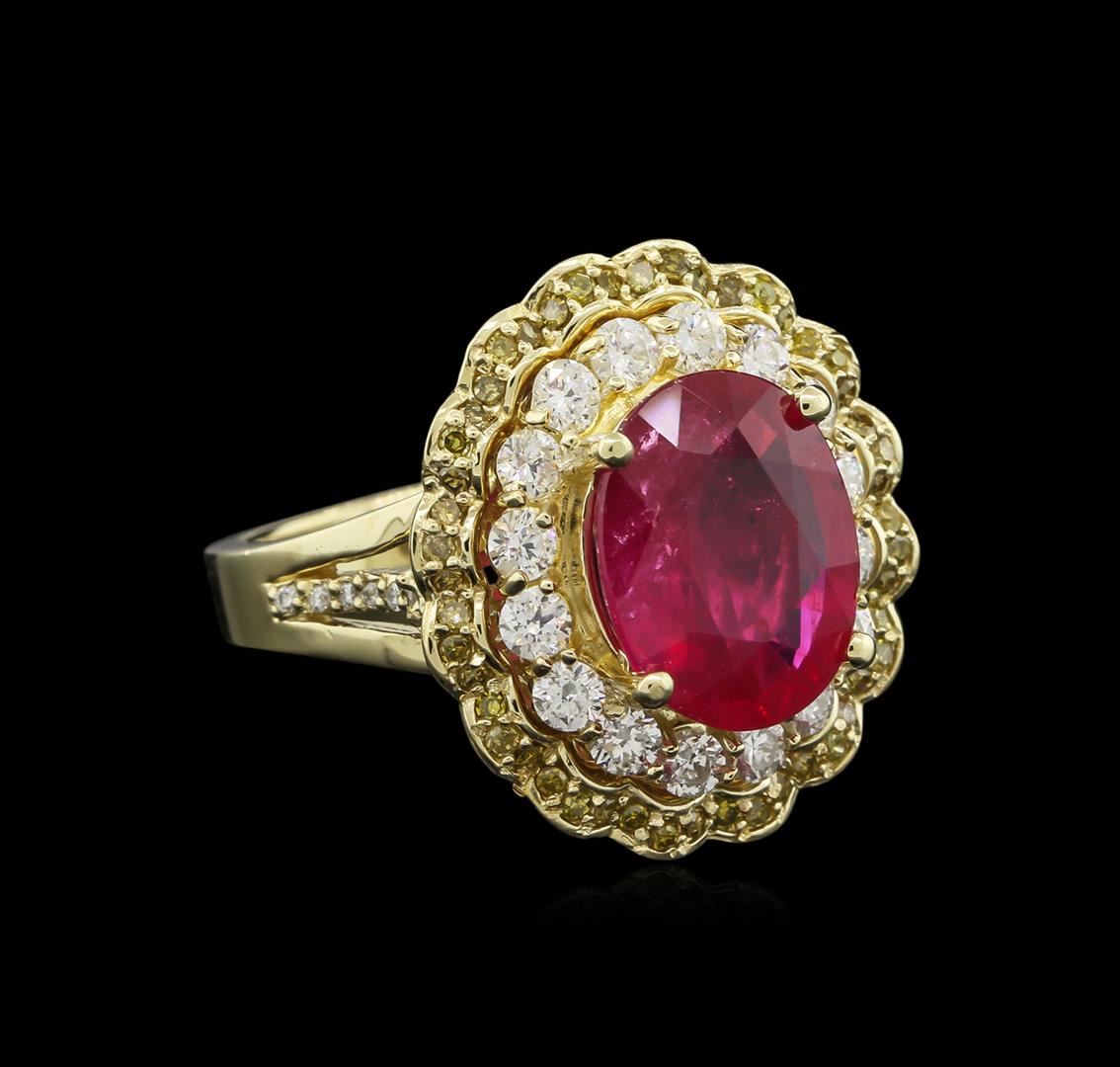 One electronically tested 14KT yellow gold ladies cast ruby and diamond ring with a bright polish finish. The featured ruby is set within an inner white diamond bezel and an outer yellow diamond bezel supported by white diamond set shoulders, completed by a two and one-half millimeter wide band. Identified with markings of "K14". Condition is new, good workmanship. Containing: One prong set oval mixed cut natural ruby approximate weight of 5.85ct., clarity is heavily included, type II, dark, very slightly brownish, slightly purplish red color, (GIA slpR 7/3), cut is good. Transmitting light somewhat diffusely, transparent to translucent. Naturally occurring internal & external characteristics are present. Indications of laboratory high temperature heat treatment, with glass & flux additives. Graded in the setting. Ruby has a low tolerance to rhodium plating, repolishing the surface, & ultrasonic cleaning. Thirty prong set round brilliant cut diamonds, measuring 2.40 - 1.00 x 1.02mm approximate total weight of 30 Stones = 1.02ct. Graded in the setting. Clarity SI-1 to I-1 Color G - I Forty-Eight prong set single cut diamonds, measuring 1.20 - 1.10 x 0.69mm (depth est.) approximate total weight of 48 Stones = 0.36ct. Color grade is an average for the group. Indications of laboratory irradiated enhanced color. Graded in the setting. Clarity SI-1 to SI-2. Total Weight of Colored Stones 5.85ct. Total Weight of Diamonds 1.38ct. Total Weight of Ring 9.57 grams. AIG Appraised at $5,975.00.