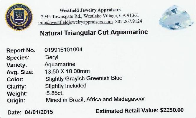One triangle cut natural aquamarine exact weight 5.85ct., clarity is slightly included, type I, medium, very slightly grayish, very slightly greenish blue color, (GIA vslgB 5/3), cut is good. Westfield Appraised at $2,250.00.