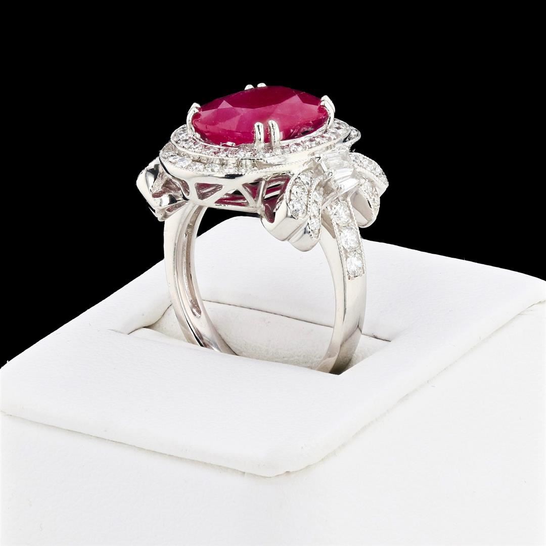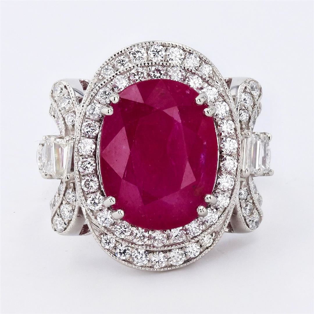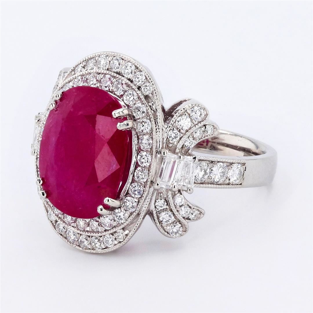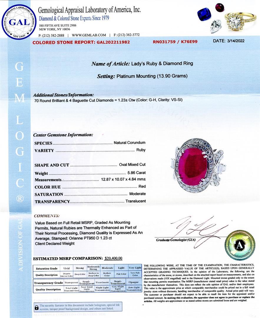 5.86ct Ruby and 1.23ctw Diamond Platinum Ring. Name of Article: Lady's Ruby and Diamond Ring Setting: Platinum Mounting (13.90 Grams) Additional Stones/Information: 70 Round Brilliant and 4 Baguette Cut Diamonds = 1.23 Ctw (Color: G-H, Clarity: VS-SI) Center Gemstone Information: SPECIES: Natural Corundum VARIETY: Ruby SHAPE AND CUT: Oval Mixed Cut Weight: 5.86 Carat Measurements: 12.87 x 10.07 x 4.84mm COLOR HUE: Red SATURATION: Moderate TRANSPARENCY: Translucent