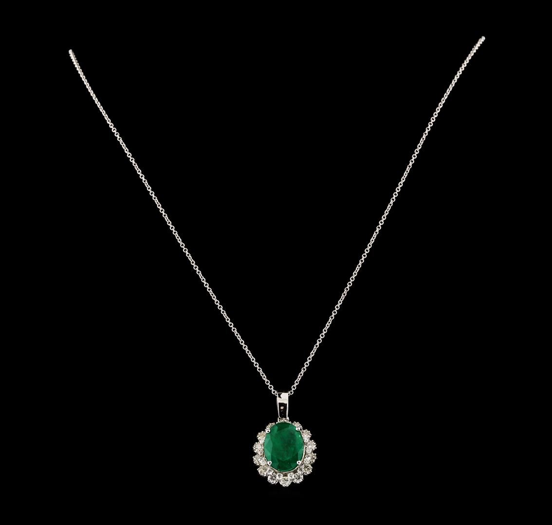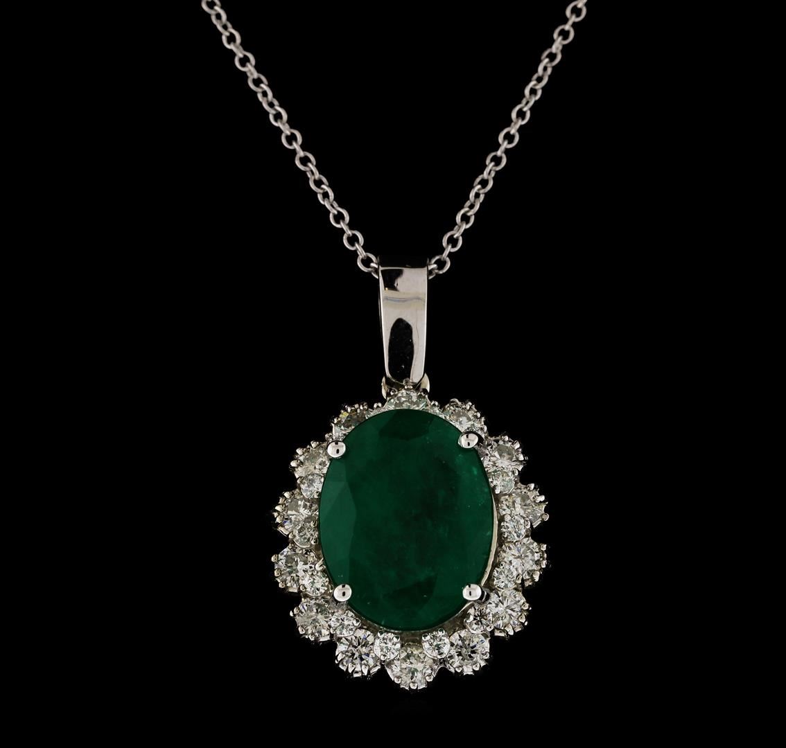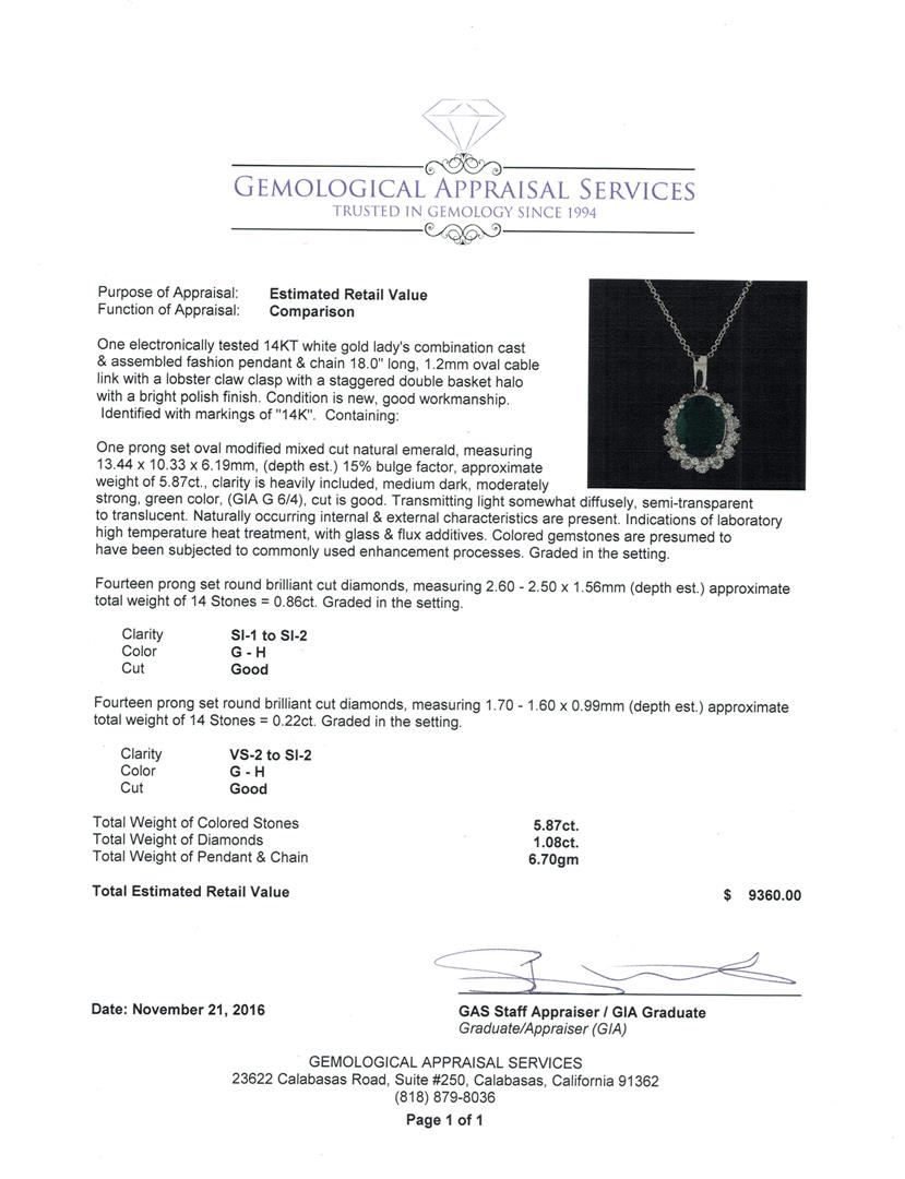 One electronically tested 14KT white gold lady's combination cast & assembled fashion pendant & chain 18.0' long, 1.2mm oval cable link with a lobster claw clasp with a staggered double basket halo with a bright polish finish. Identified with markings of '14K'. Condition is new, good workmanship. Containing: One prong set oval modified mixed cut natural emerald, measuring 13.44 x 10.33 x 6.19mm, (depth est.) 15%. bulge factor, approximate weight of 5.87ct., clarity is heavily included, medium dark, moderately strong, green color, (GIA G 6/4), cut is good. Transmitting light somewhat diffusely, semi-transparent to translucent. Naturally occurring internal & external characteristics are present. Indications of laboratory high temperature heat treatment, with glass & flux additives. Colored gemstones are presumed to have been subjected to commonly used enhancement processes. Graded in the setting. Fourteen prong set round brilliant cut diamonds, measuring 2.60 - 2.50 x 1.56mm (depth est.) approximate total weight of 14 Stones = 0.86ct. Graded in the setting. Clarity SI-1 to SI-2. Color: G - H Cut Good Fourteen prong set round brilliant cut diamonds, measuring 1.70 - 1.60 x 0.99mm (depth est.) approximate total weight of 14 Stones = 0.22ct. Graded in the setting. Clarity VS-2 to SI-2. Color: G - H Cut Good. Total Weight of Colored Stones 5.87ct.. Total Weight of Diamonds 1.08ct.. Total Weight of Pendant & Chain 6.70gm. GAS Appraised at $9,360.00.