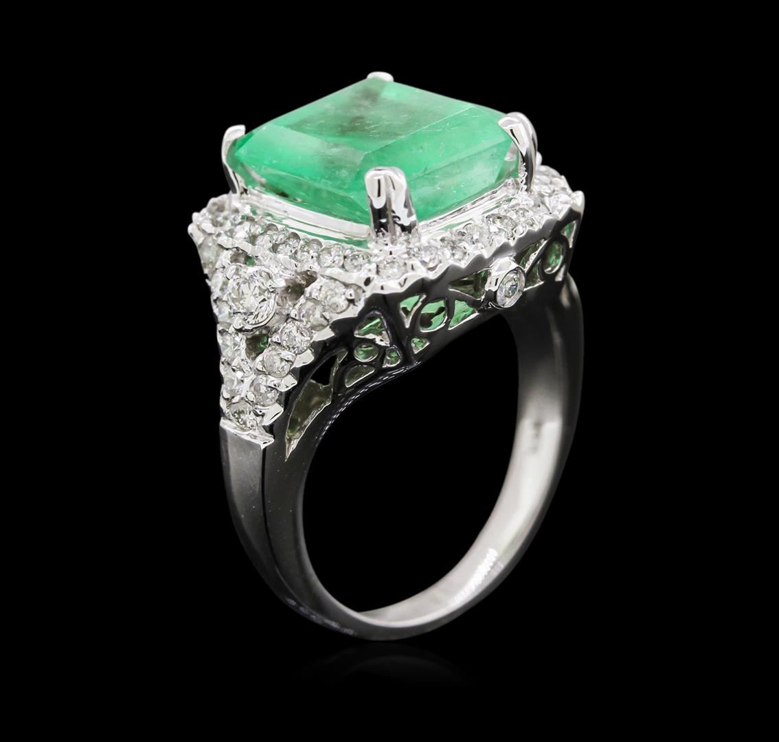 One electronically tested 14KT white gold lady's cast fashion ring with a halo with a bright polish finish. The featured lady's ring has a shank measuring 2.5 millimeters wide Identified with markings of "14K". Condition is new, good workmanship. Containing: One prong set emerald step cut natural emerald, measuring 11.02 x 10.55 x 7.00mm, approximate weight of 5.87ct., clarity is moderately included, type III, medium light, very slightly grayish, very slightly bluish green color, (GIA vslbG 4/3), cut is good. Transmitting light somewhat diffusely, transparent to translucent. Naturally occurring internal & external characteristics are present. Indications of oil residue. Graded in the setting. Two prong set round brilliant cut diamonds, measuring 2.70 - 2.60 x 1.72mm (depth est.) approximate total weight of 2 Stones = 0.16ct. Graded in the setting. Clarity: SI-1. Color: Good Fifty-Four prong set round brilliant cut diamonds, measuring 1.45 - 1.35 x 0.91mm (depth est.) approximate total weight of 54 Stones = 0.58ct. Graded in the setting. Clarity: SI-2 to I-1. Color: G - Good. Total Weight of Colored Stones 5.87ct. Total Weight of Diamonds 0.74ct. Total Weight of Ring 9.60gm. GAS Appraised at $9,675.00.