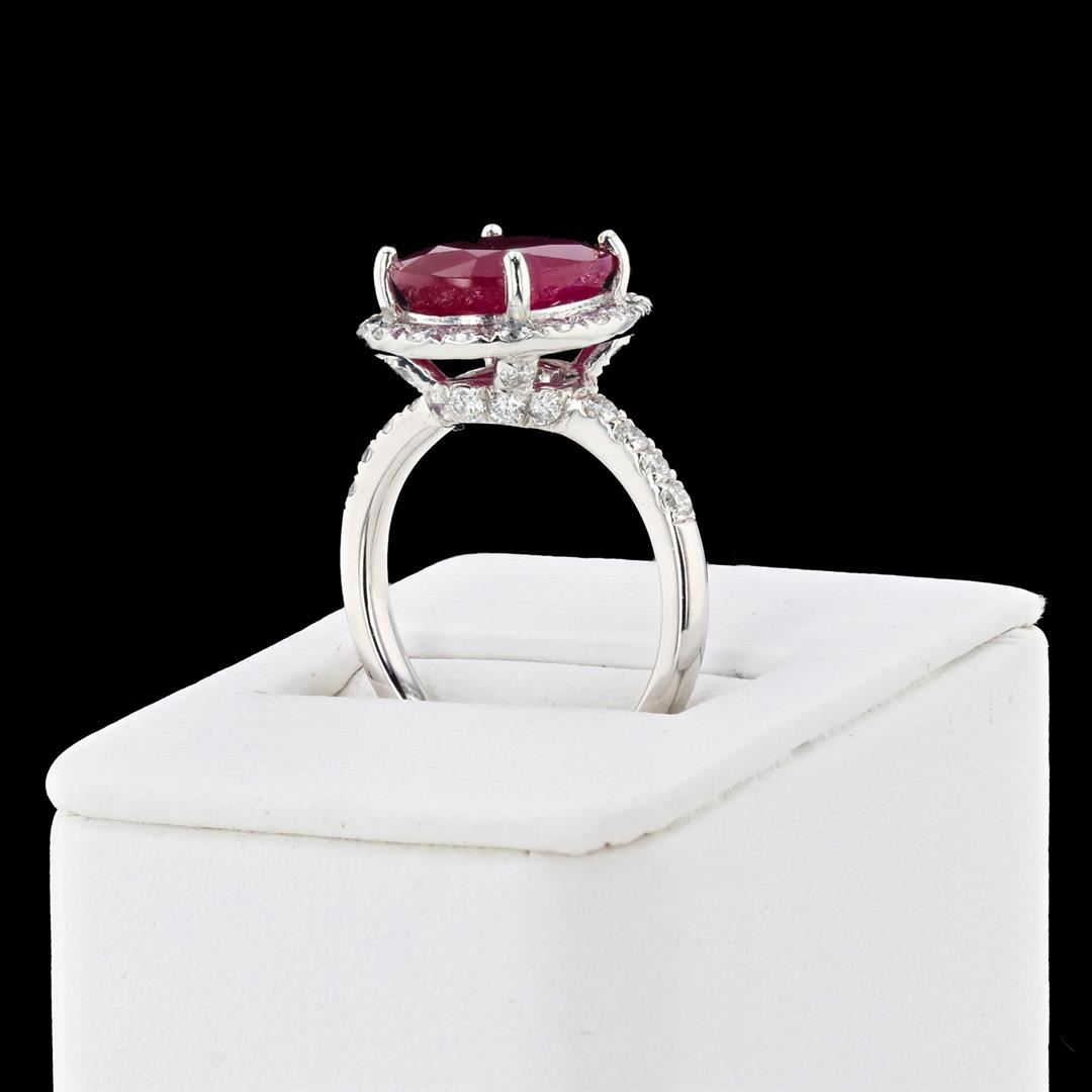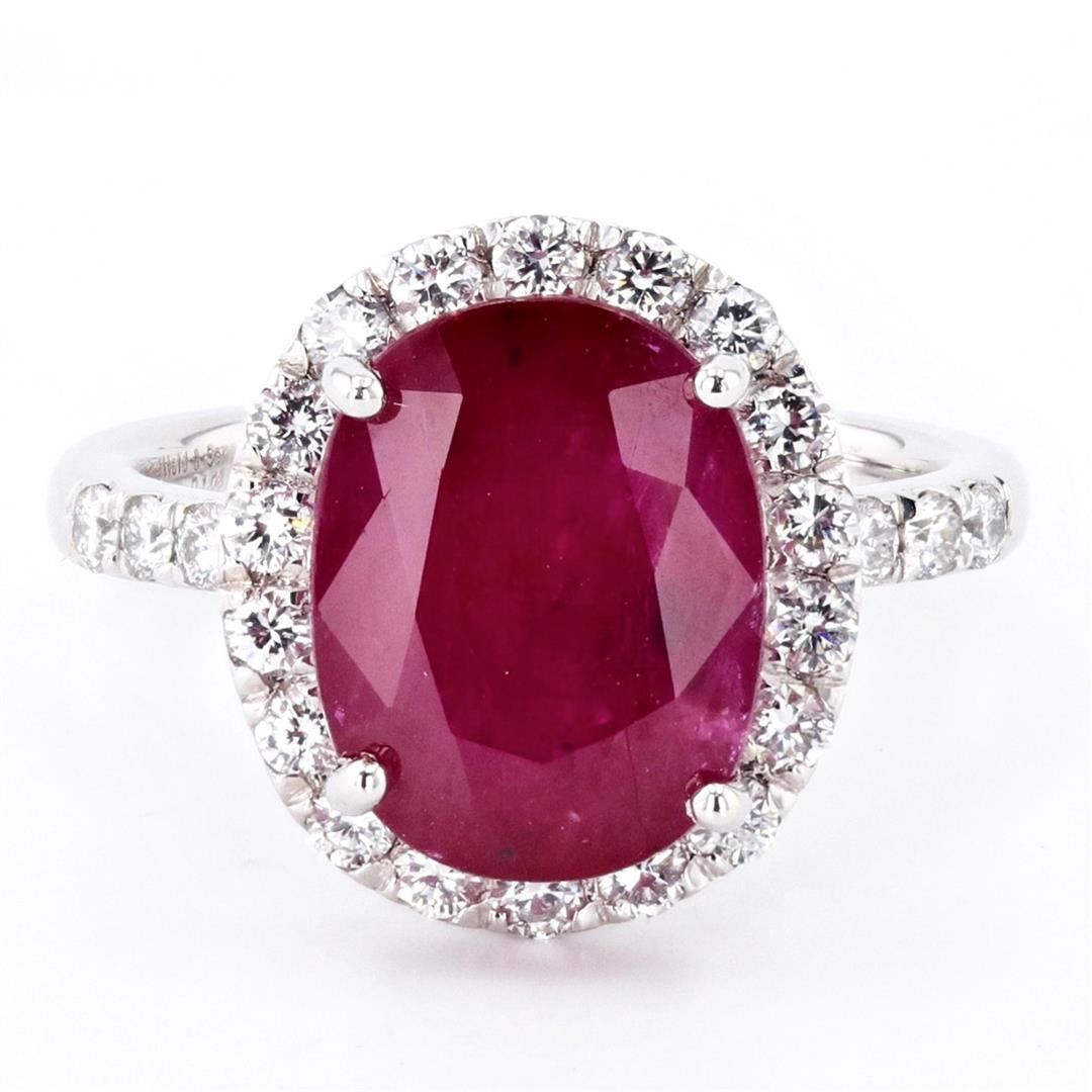 5.87ct Ruby and 1.03ctw Diamond Platinum Ring. Please see Photos and Description for all available information. This engagement ring is made of platinum and features a large 5.87ct ruby center stone and 40 round brilliant cut diamonds weighing 1.03ct total. This ring is available in a size 6 1/2.