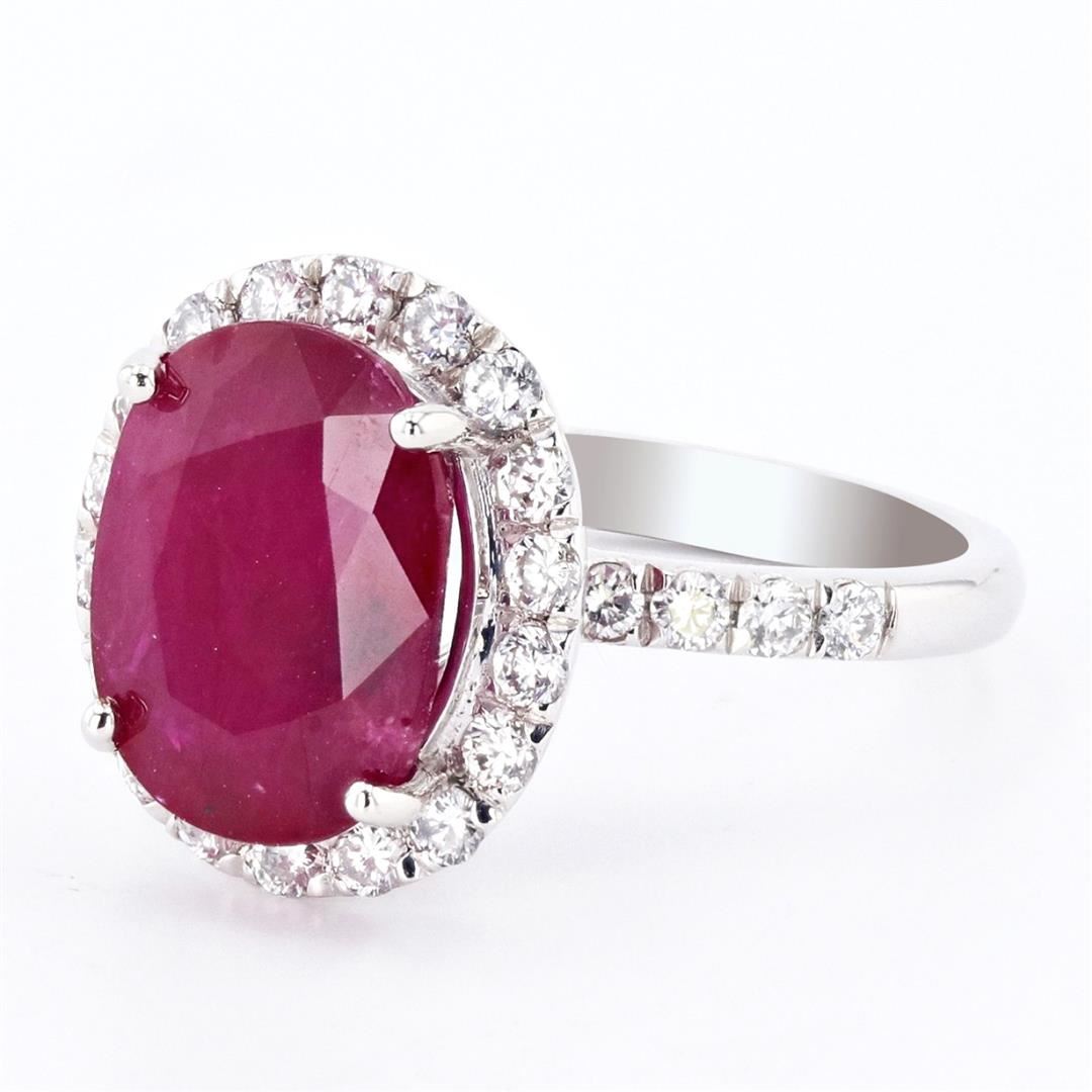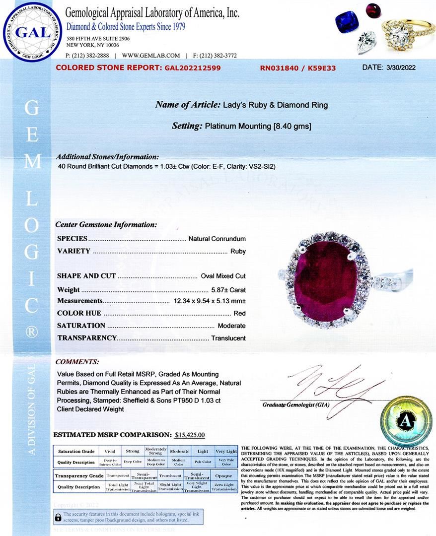 5.87ct Ruby and 1.03ctw Diamond Platinum Ring. Please see Photos and Description for all available information. This engagement ring is made of platinum and features a large 5.87ct ruby center stone and 40 round brilliant cut diamonds weighing 1.03ct total. This ring is available in a size 6 1/2.